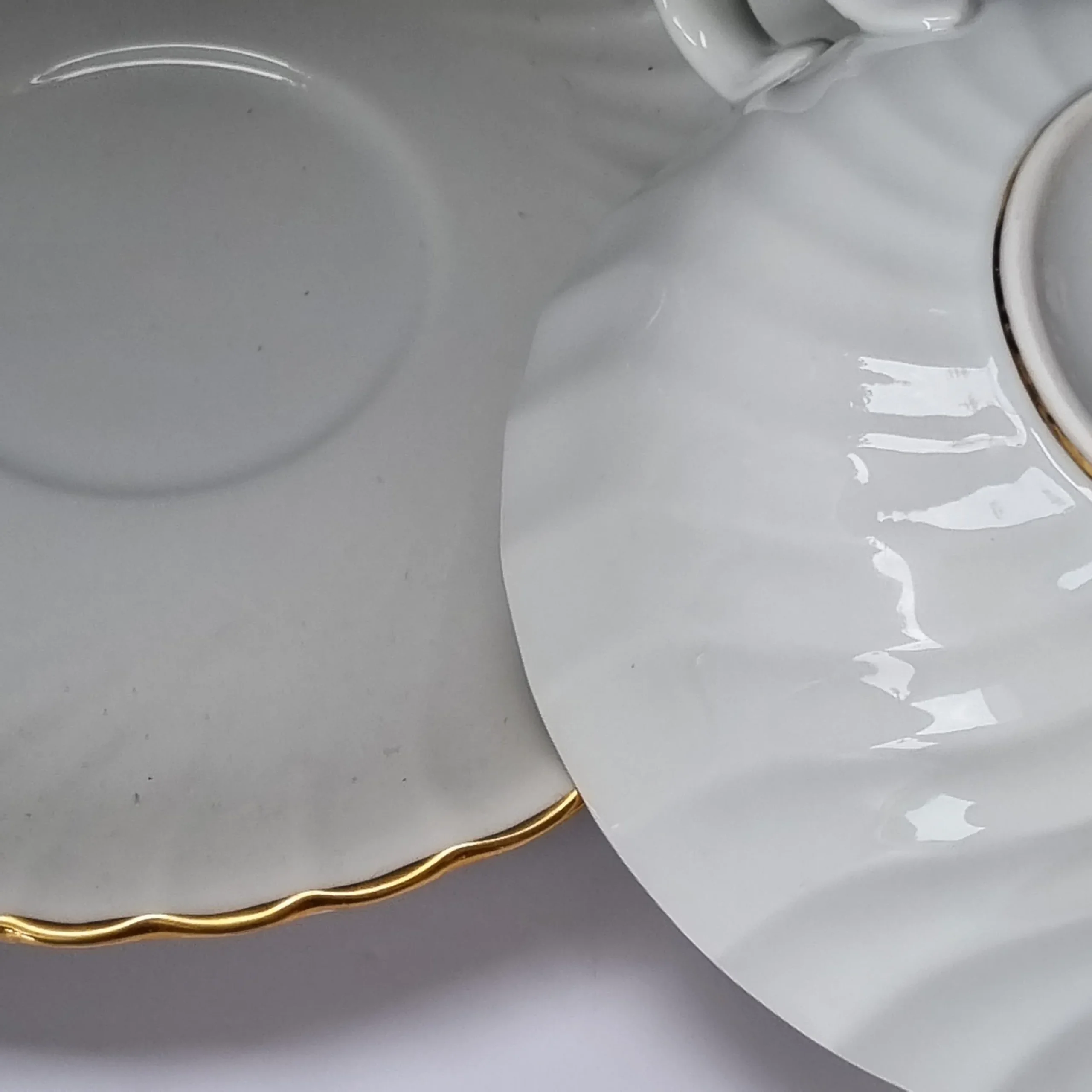 Diez juegos de taza de doble asa y platillo, en porcelana blanca y filo de oro, procedentes del distribuidor Grifé y Escoda (Barcelona y Madrid). Década de 1960. En muy buen estado. Puede presentar ligeros signos de uso corriente anterior. Observe las fotografías, forman parte de la descripción. En total, 20 piezas.