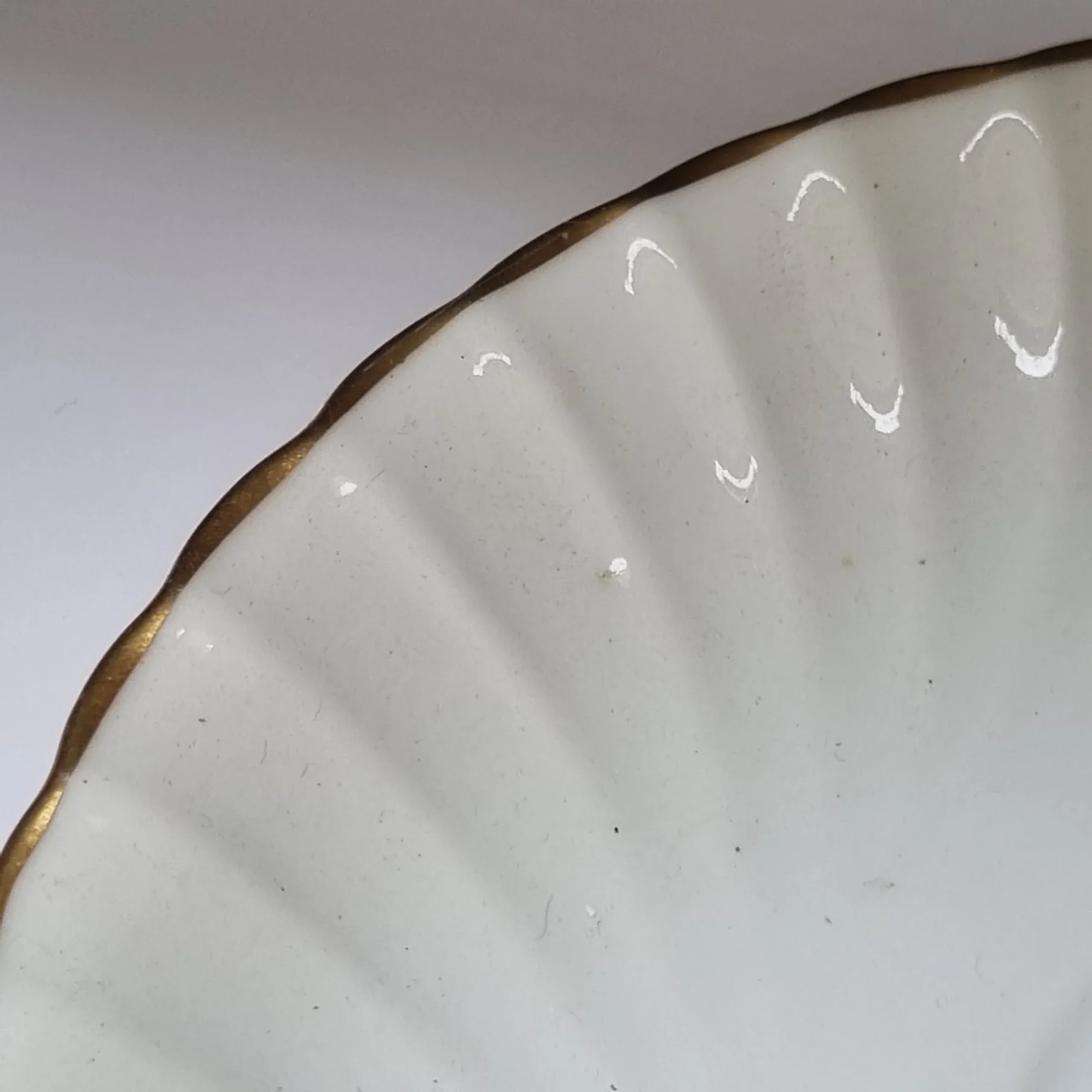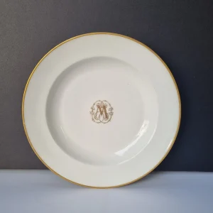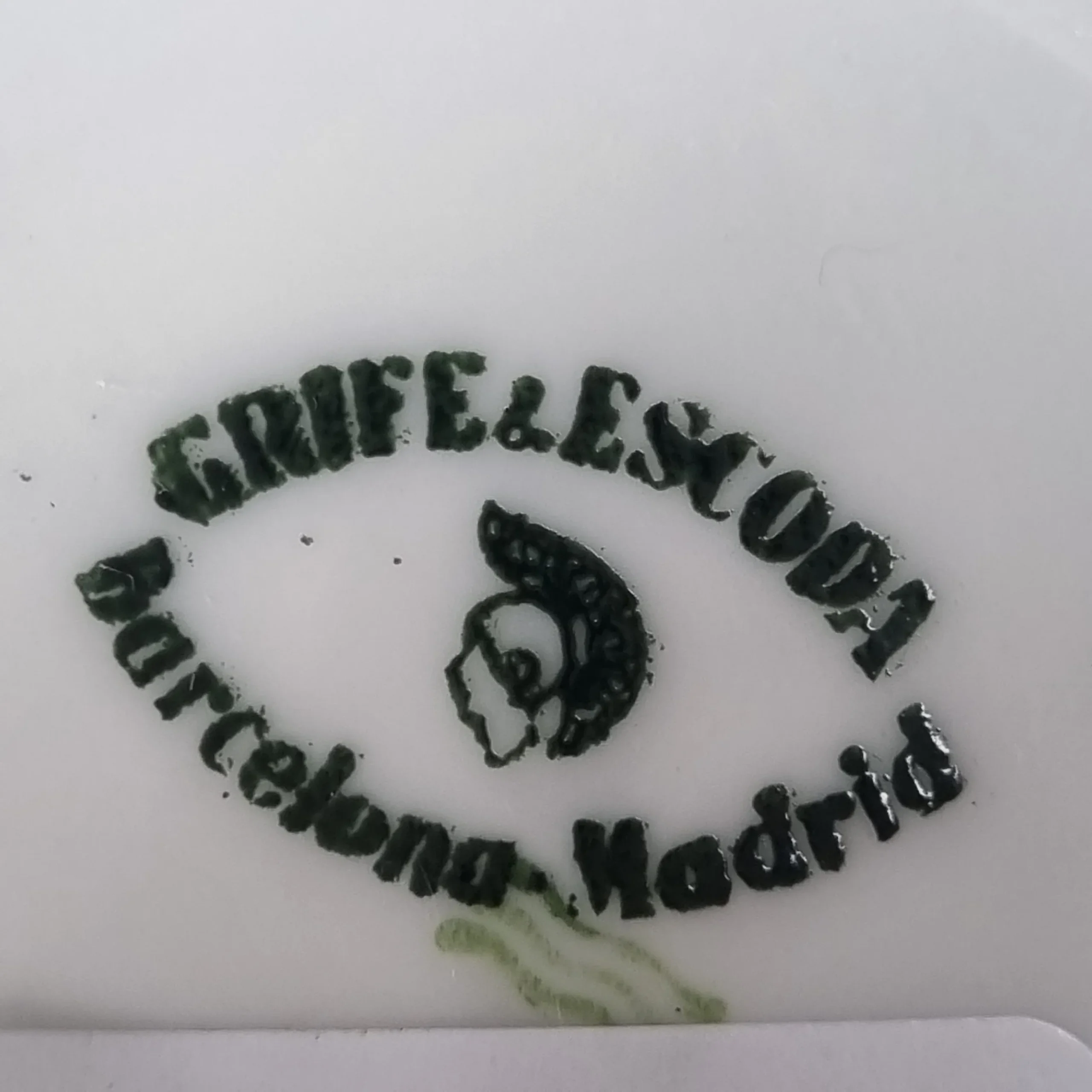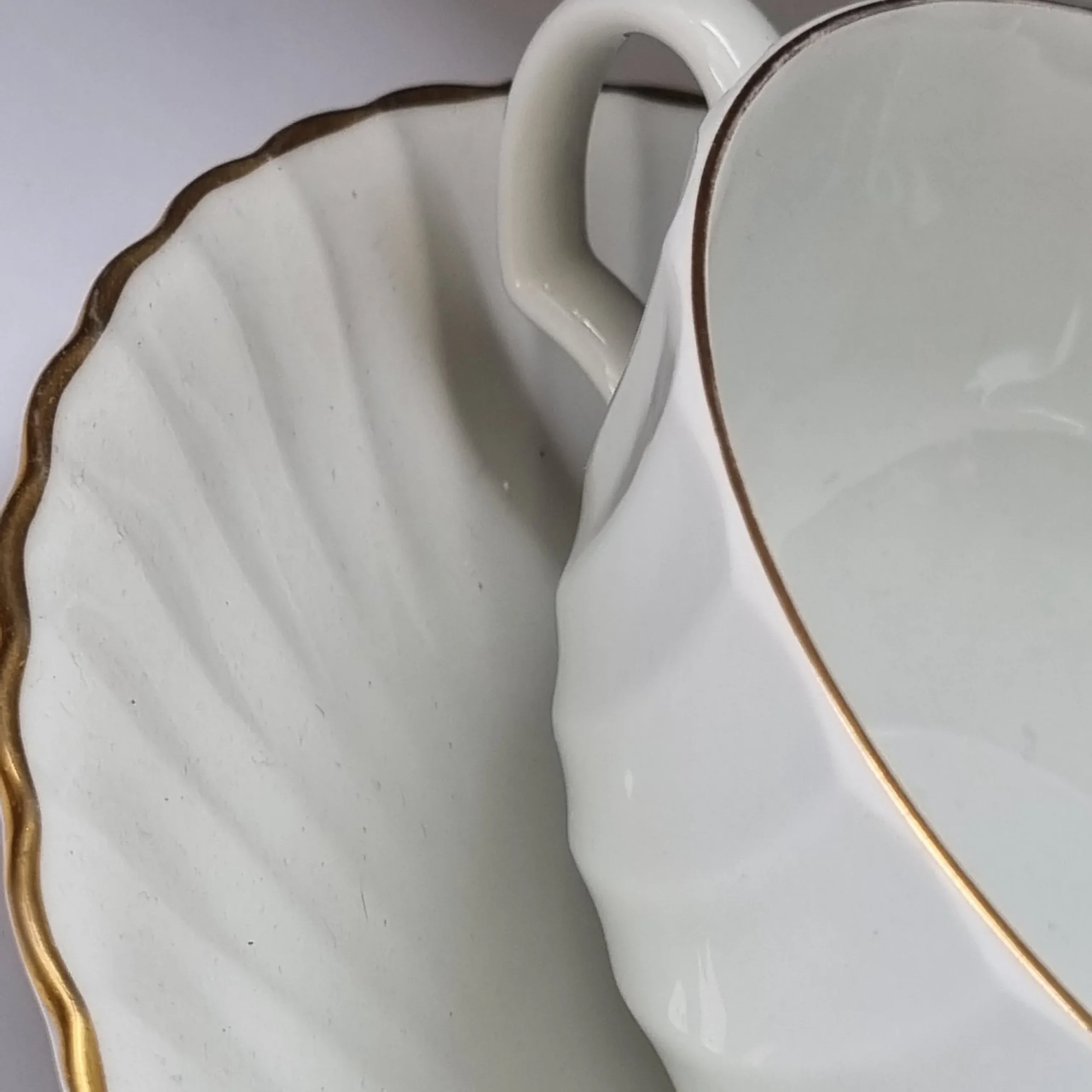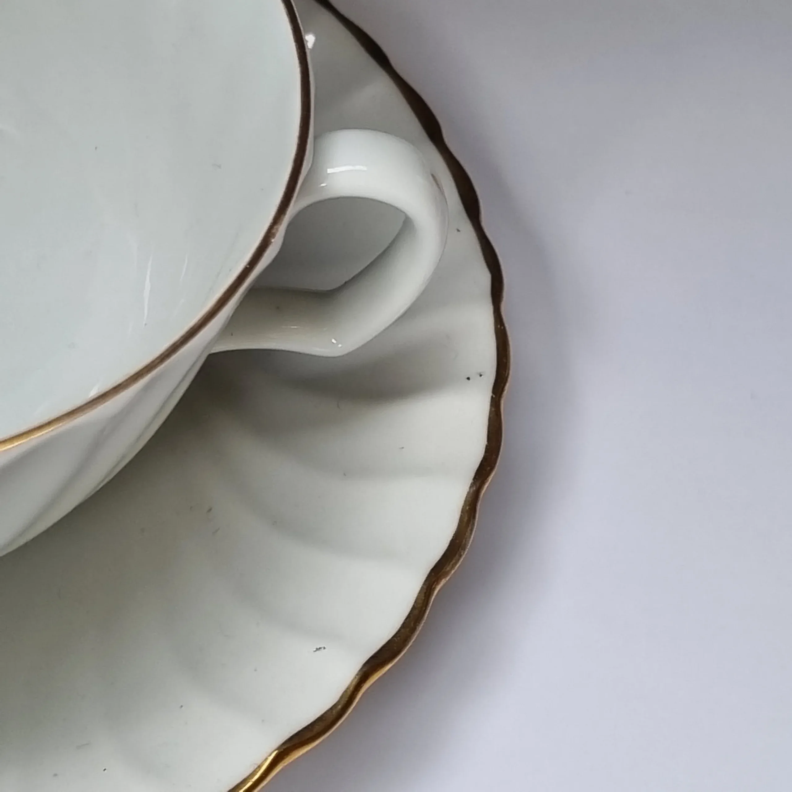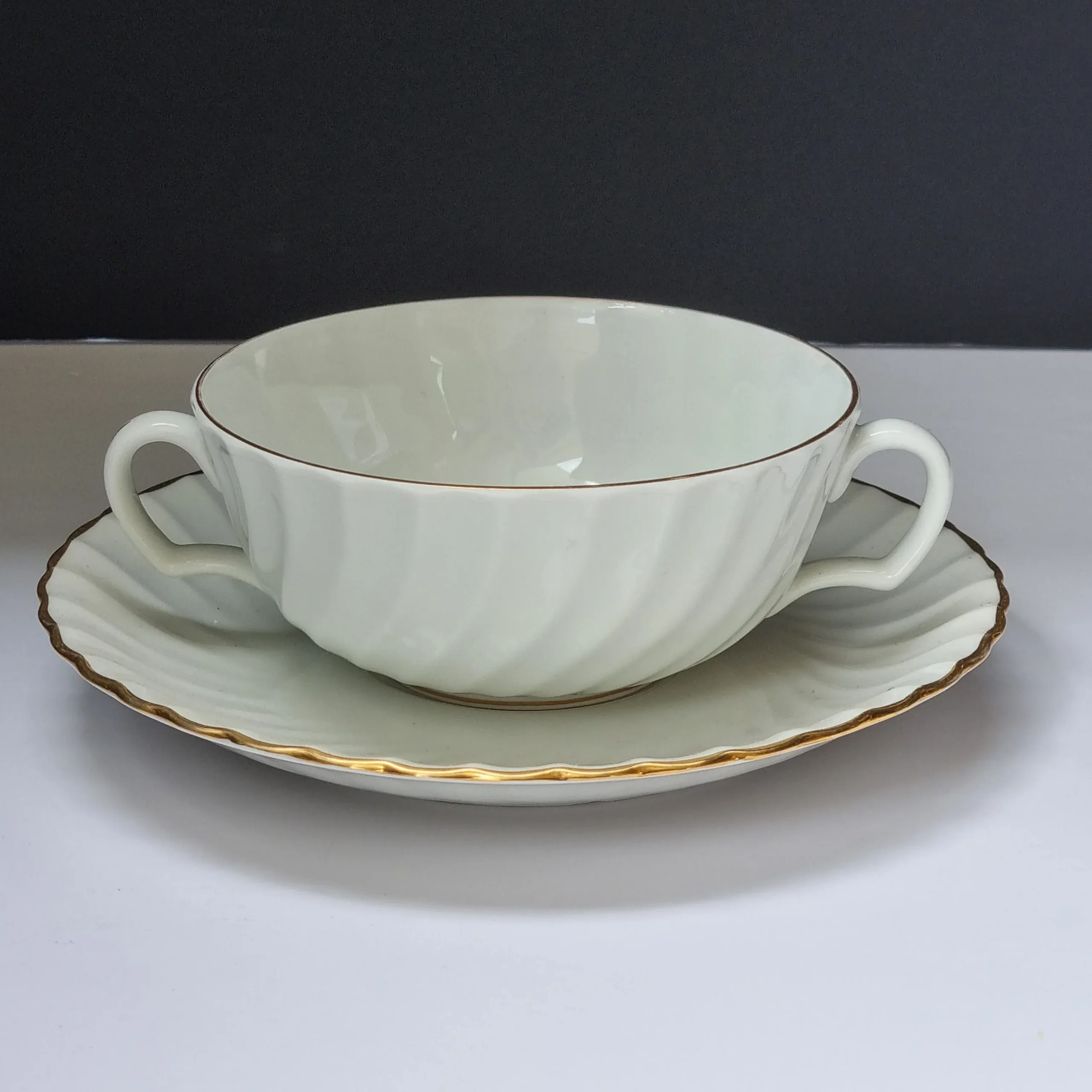Diez juegos de taza de doble asa y platillo, en porcelana blanca y filo de oro, procedentes del distribuidor Grifé y Escoda (Barcelona y Madrid). Década de 1960. En muy buen estado. Puede presentar ligeros signos de uso corriente anterior. Observe las fotografías, forman parte de la descripción. En total, 20 piezas.