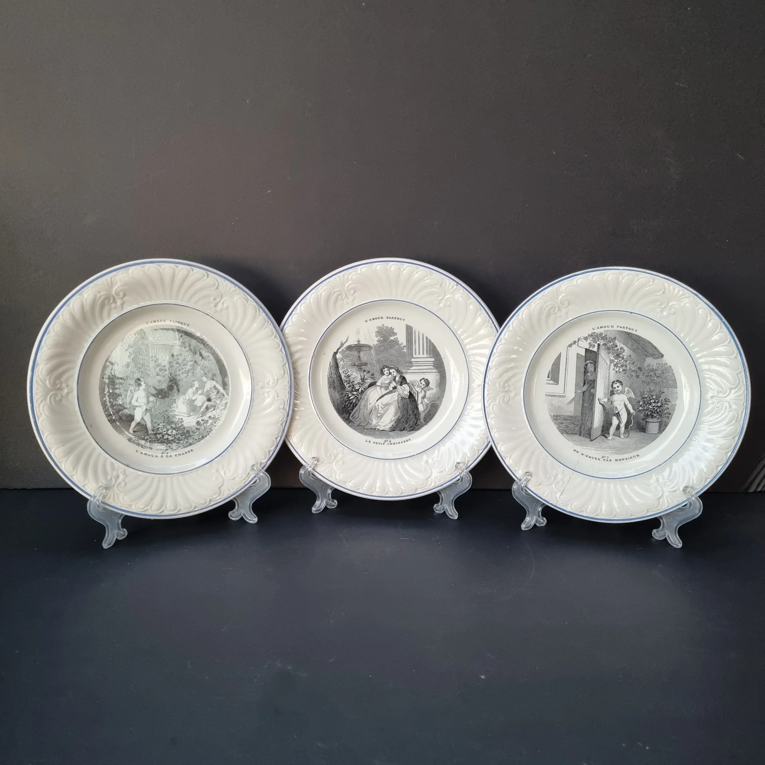 Colección «L´Amour Partout» de Creil et Montereau. Francia, siglo XIX. «El amor en todas partes», una serie de 10 platos de loza fina, con el ala en relieve y escenas sobre el amor, representado por un querubín. Buen estado de uso en general. Presentan signos del paso del tiempo, acorde a su antigüedad y uso anterior, ligeros desgastes y roces, o chips ocasionales. Uno de los platos tiene una línea. Observe las fotografías, forman parte de su descripción.