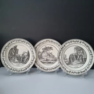 Procedentes de una antigua vajilla de «terre de fer» de la fábricas de St. Amand et Hamage Nord. Fondo blanco, relieve en el ala y decoración en azul, en el filo interior y parcialmente sobre el relieve. Sigue los patrones de las cerámicas de Rouen y Nevers. Signos propios de su antigüedad. Buen estado de conservación. Por su tamaño pueden emplearse como platos de entrante o de postre. Francia, periodo 1896-1920. Observe las fotografías, son parte de su descripción.