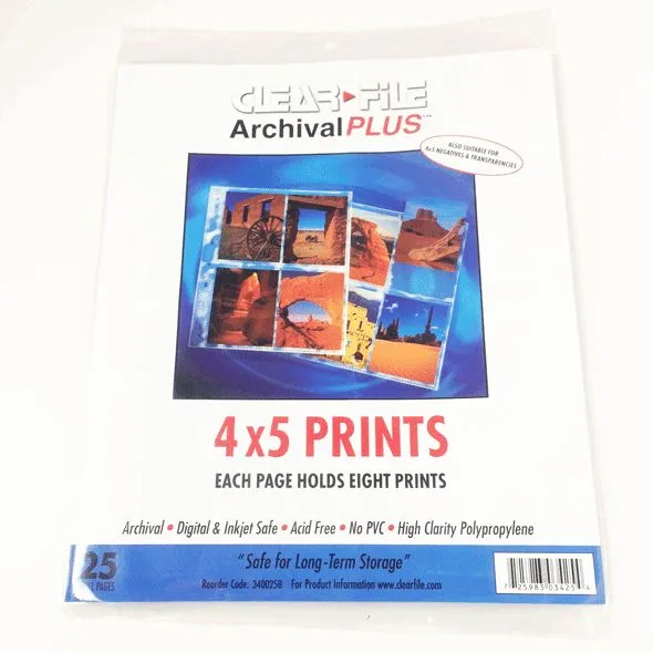 25 fundas de polipropileno para negativos/transparencias o copias de 10×12 cm. (4×5″). Calidad de archivo. Capacidad: 4 negativos o 8 copias. Transparentes para poder hacer contactos.