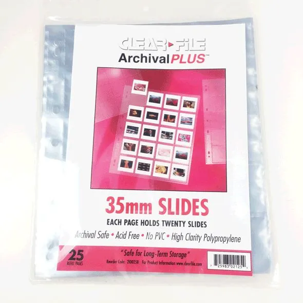 25 fundas de plástico transparente para diapos de 35mm (5×5 cm.) de la marca CLEARFILE. Calidad de archivo. Capacidad: 20 diapos (5 tiras de 4 diapos). Transparentes para su fácil visionado.
