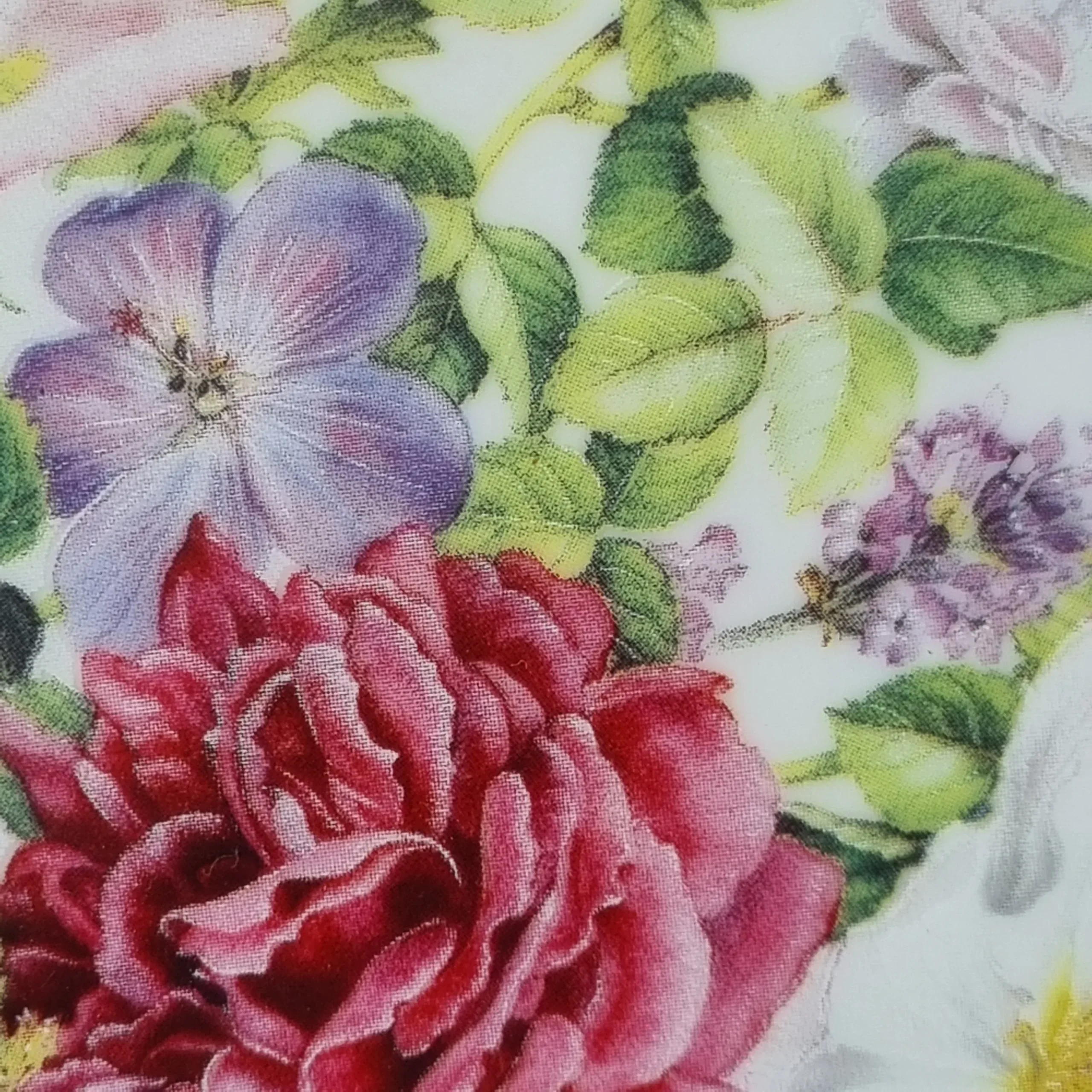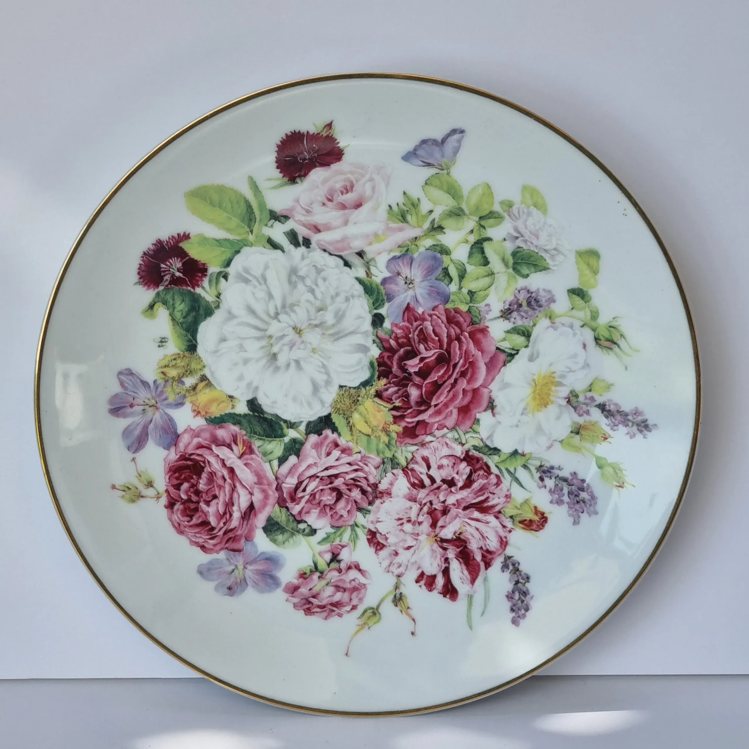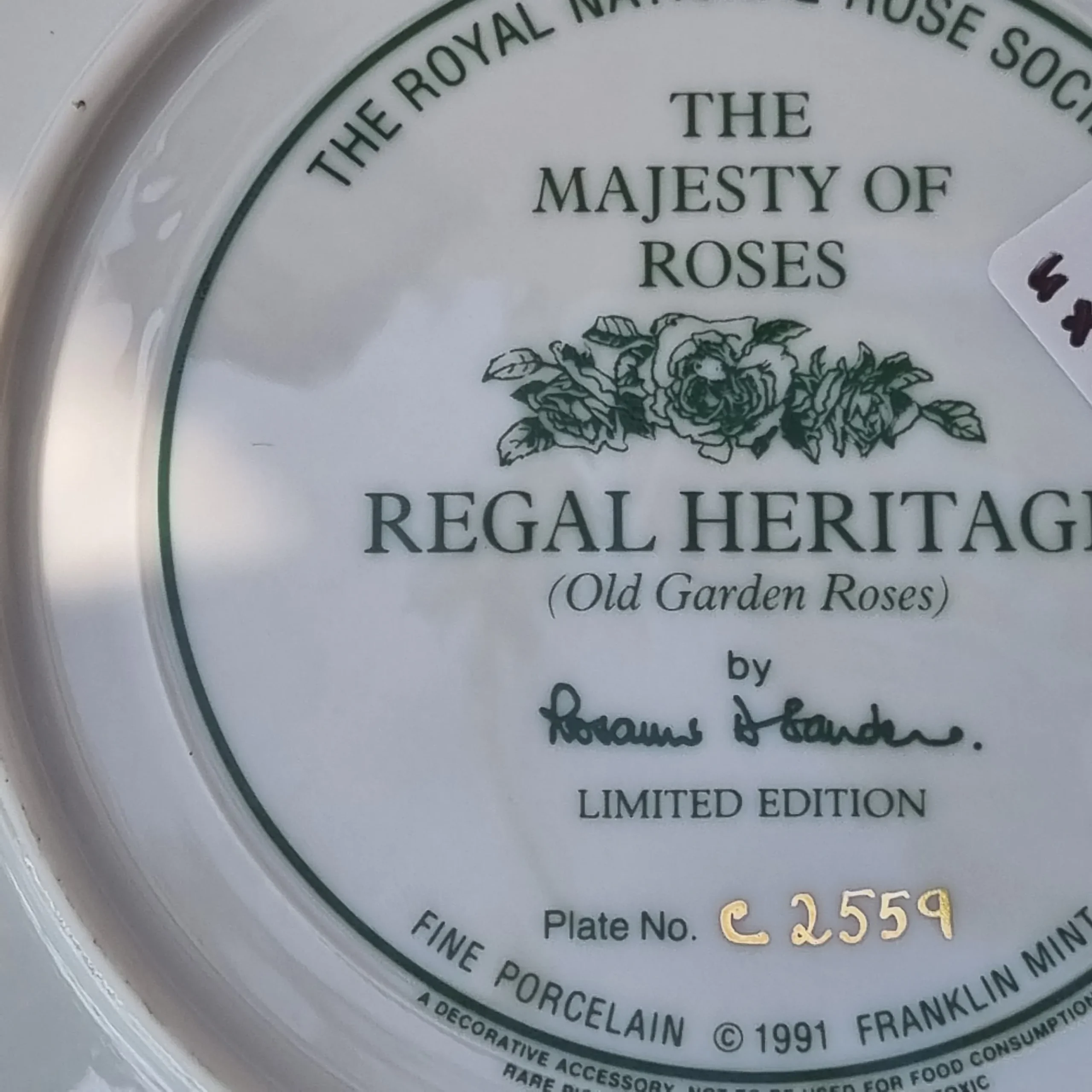 Grupo de cinco platos de porcelana inglesa, fondo blanco, decoración policromada de flores y filo en oro. Fabricados por Franklin Mint en 1991, forman parte de la colección The Majesty of Roses, Regal Heritage, en una edición liitada para The Royal National Society inglesa. Los platos están marcados y numerados. Muy buen estado general, observe las fotografías, son parte de la descripción. Reino Unido, década de 1990.