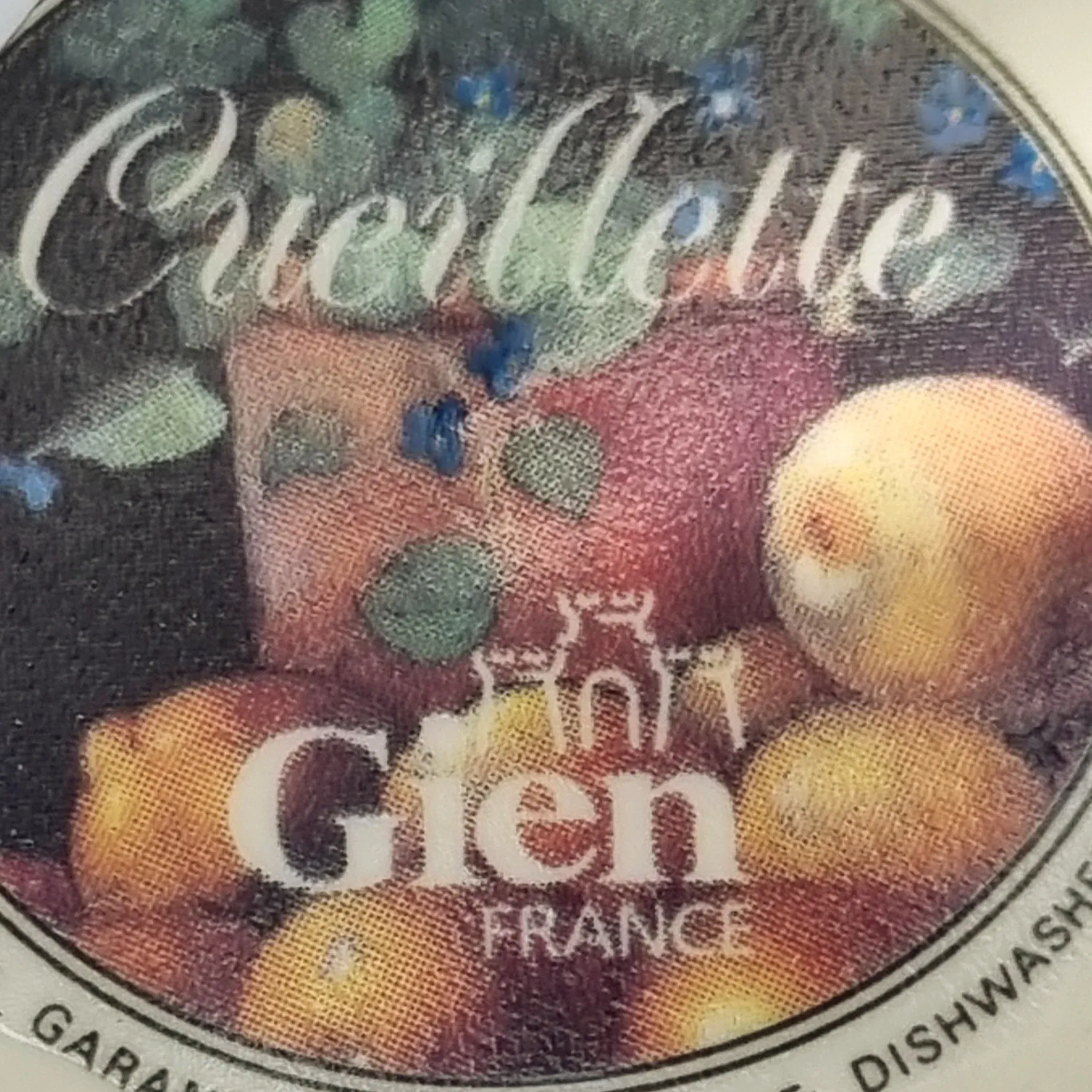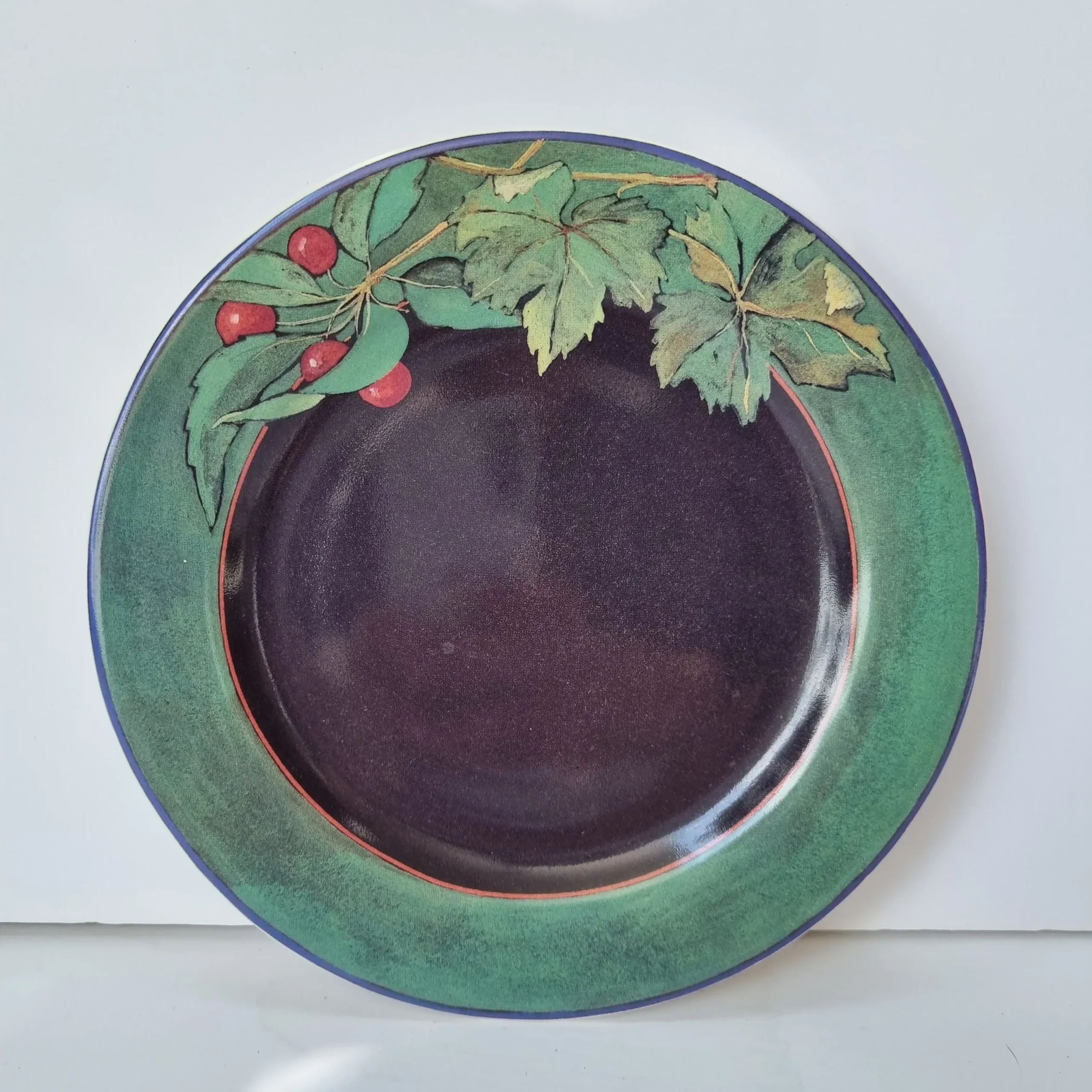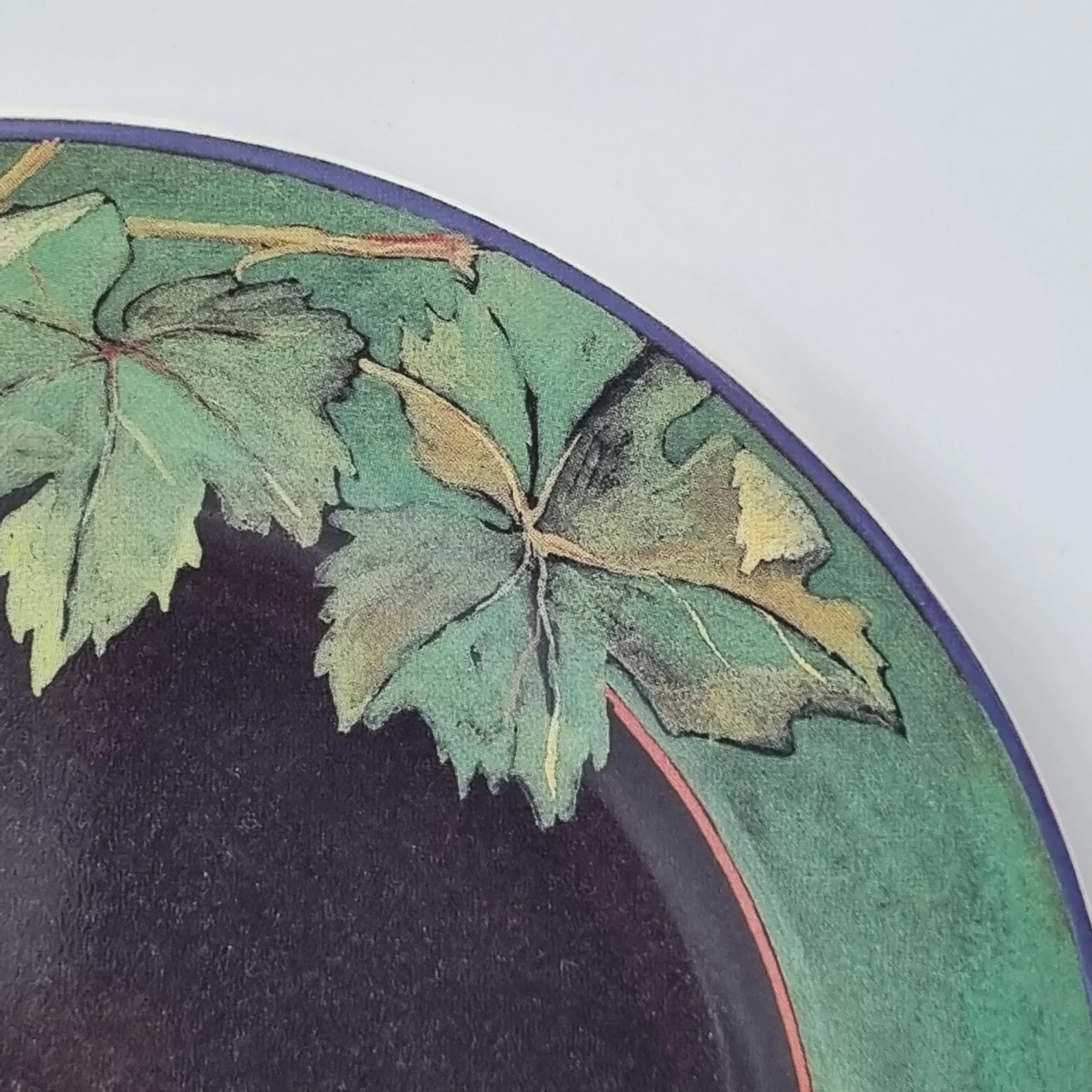 Originales platos de postre pintados a mano, de cerámica de Gien, manufactura francesa que ha recibido el título de Empresa de Patrimonio Vivo Francés, por sus técnicas tradicionales, sus 200 años de historia y su gran implementación. Francia, década de 1980. Estos platos presentan un fondo oscuro y ramas de cerezo con sus frutos. Filo interno en rojo y filo externo en azul. Muy buen estado general. Sin accidentes, sin fisuras. Observe las fotografías, son parte de la descripción.
