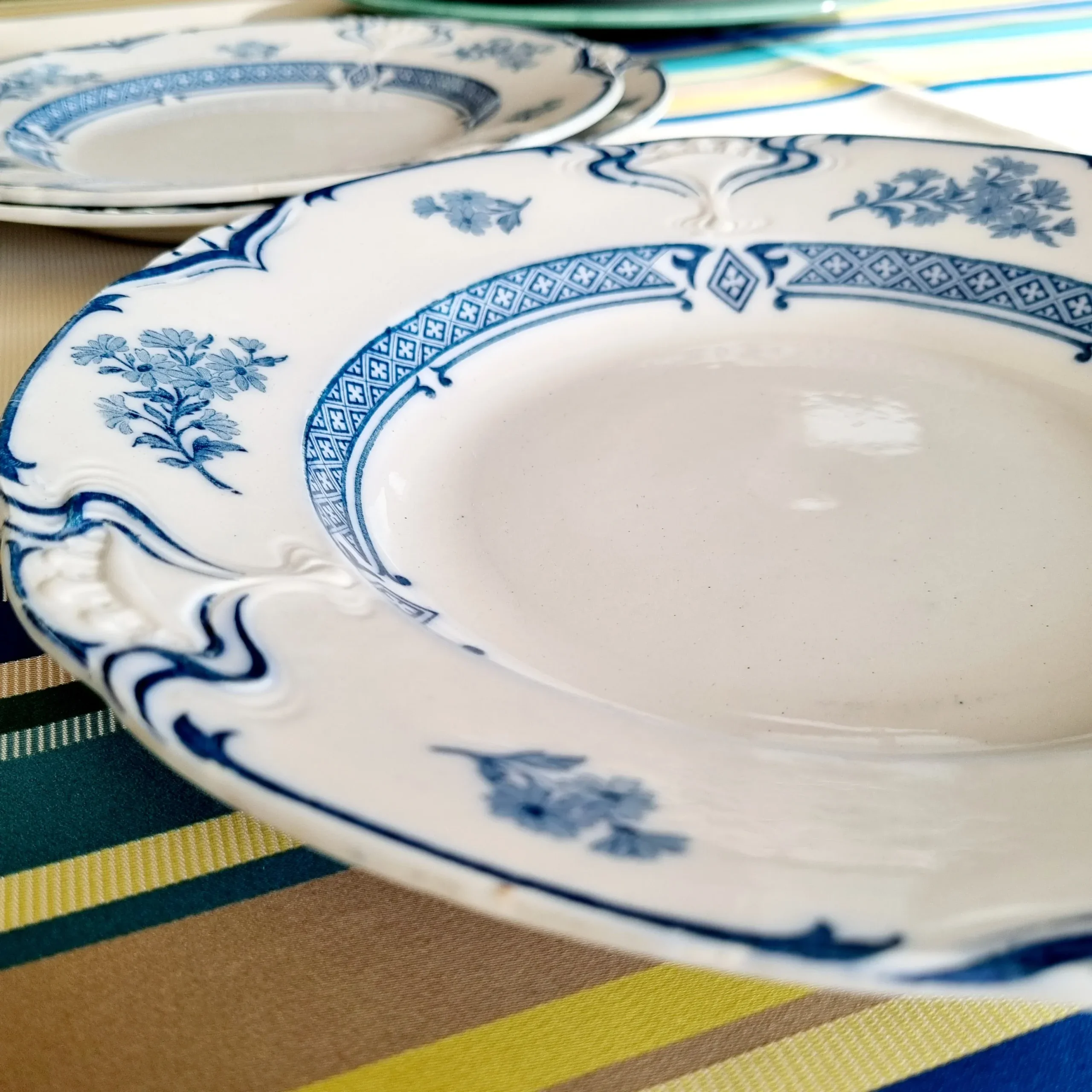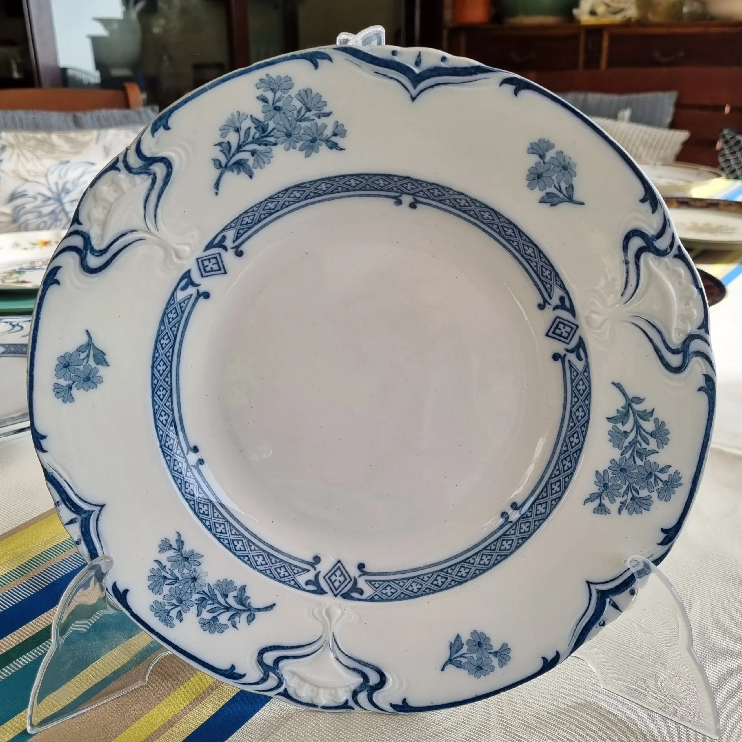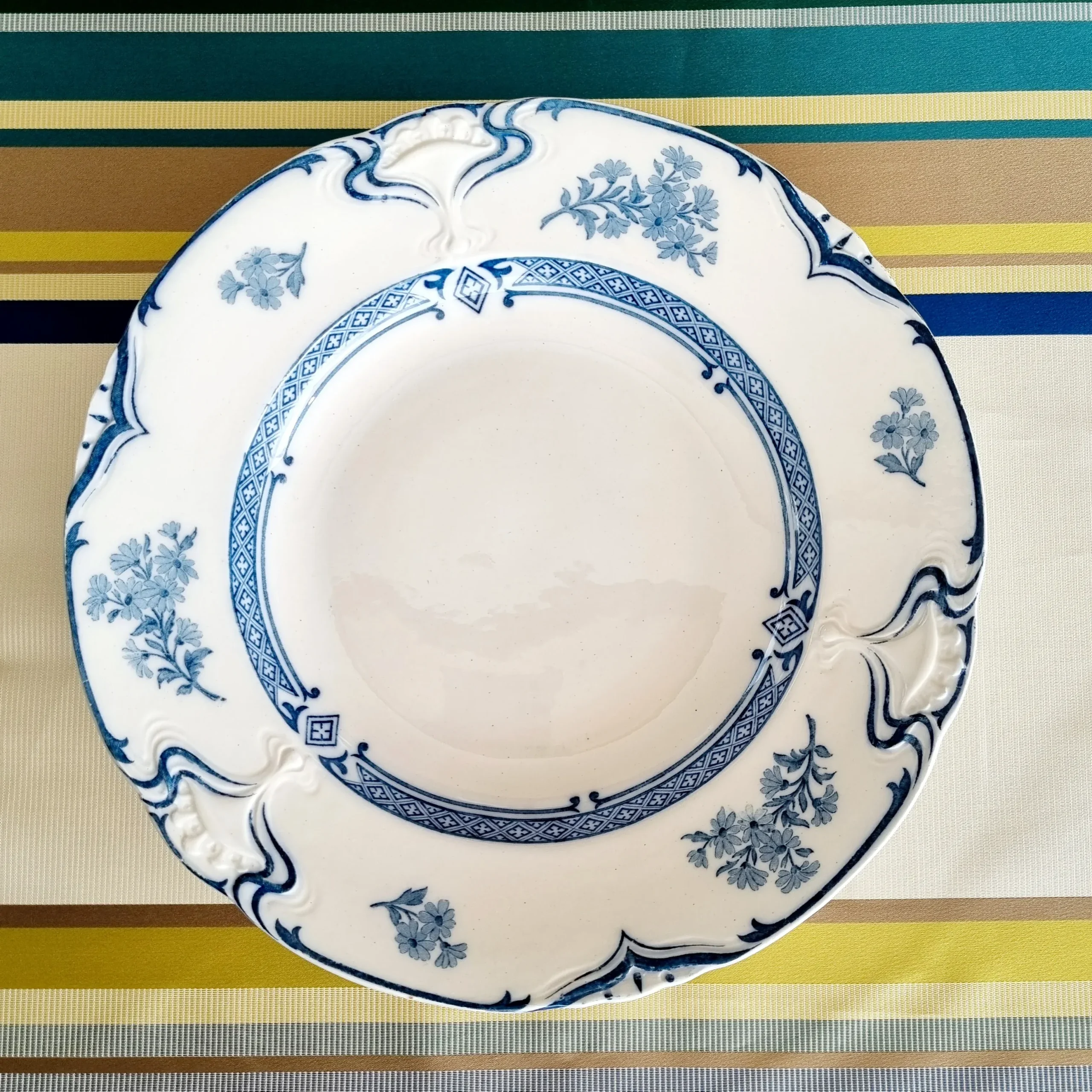 Procedentes de una antigua vajilla de «terre de fer» de la fábricas de St. Amand et Hamage Nord. Fondo blanco, relieve en el ala y decoración en azul, en el filo interior y parcialmente sobre el relieve. El diseño sigue los patrones de las cerámicas de Rouen y Nevers de la época. Signos propios de su antigüedad. Buen estado de conservación. Francia, periodo 1896-1920. Observe las fotografías, son parte de su descripción.