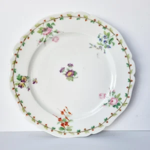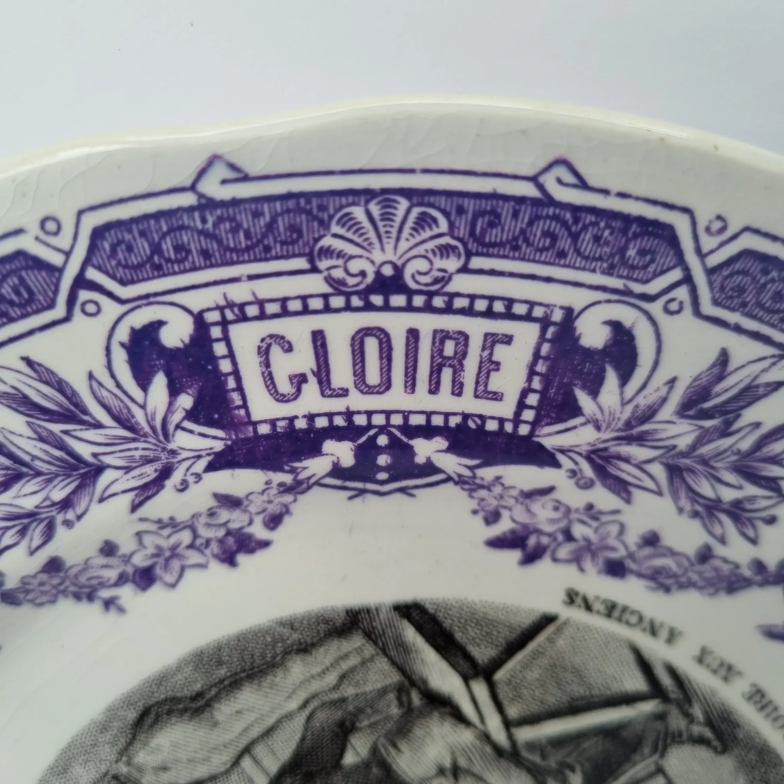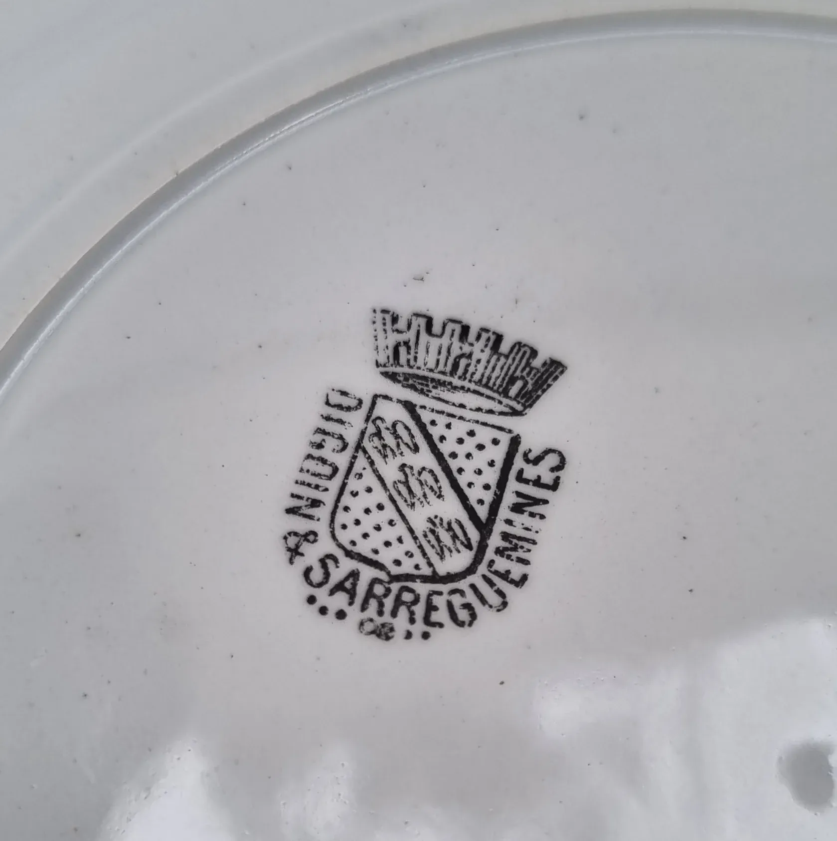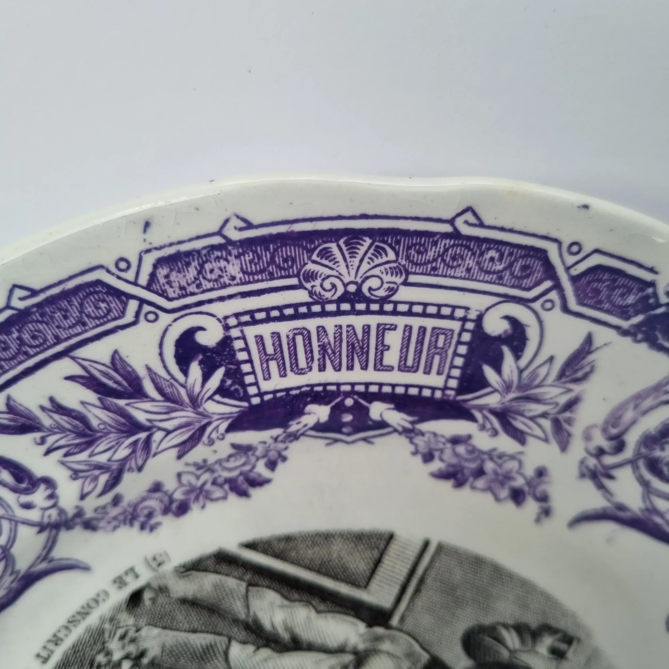 Seis decorativos platos «parlantes» de Digoin et Sarreguemines. Colección «La vida militar». Orla profusamente decorada en color malva y escenas centrales en negro sobre blanco. En buen estado de uso. Signos propios de su antigüedad y autenticidad. Francia, finales del siglo XIX. Observe las fotografías, forman parte de su descripción.