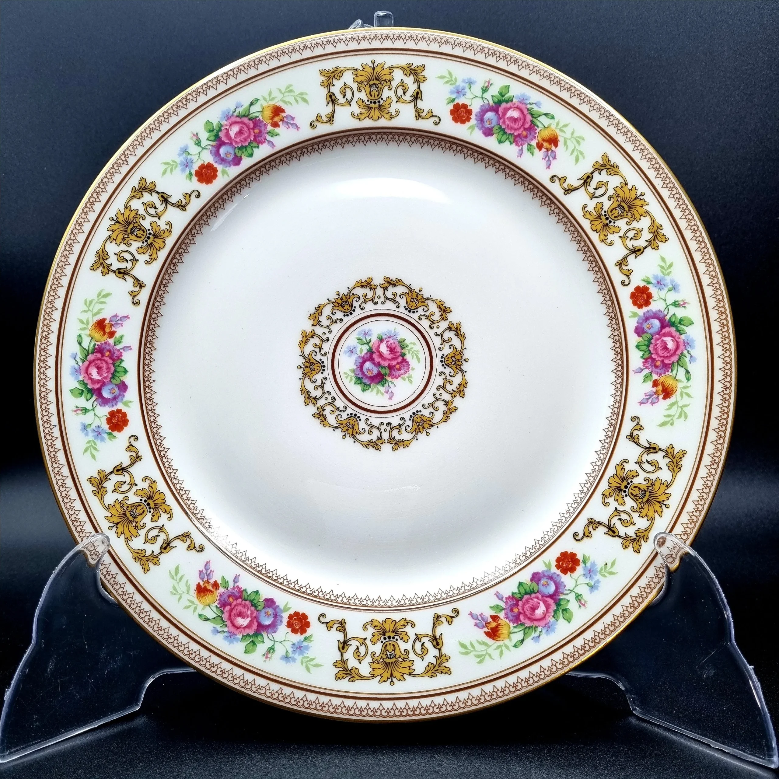 Conjunto de ocho platos de porcelana, llanos ,vintage, de 25 cm, de la manufactura Raynaud en Limoges. Siglo XX, años 60. Muy buen estado funcional y estético. Signos menores de uso anterior. Ideales para combinar con otros platos. Preciosa ala floral y dorada. Centro del plato decorado. Filo oro.
