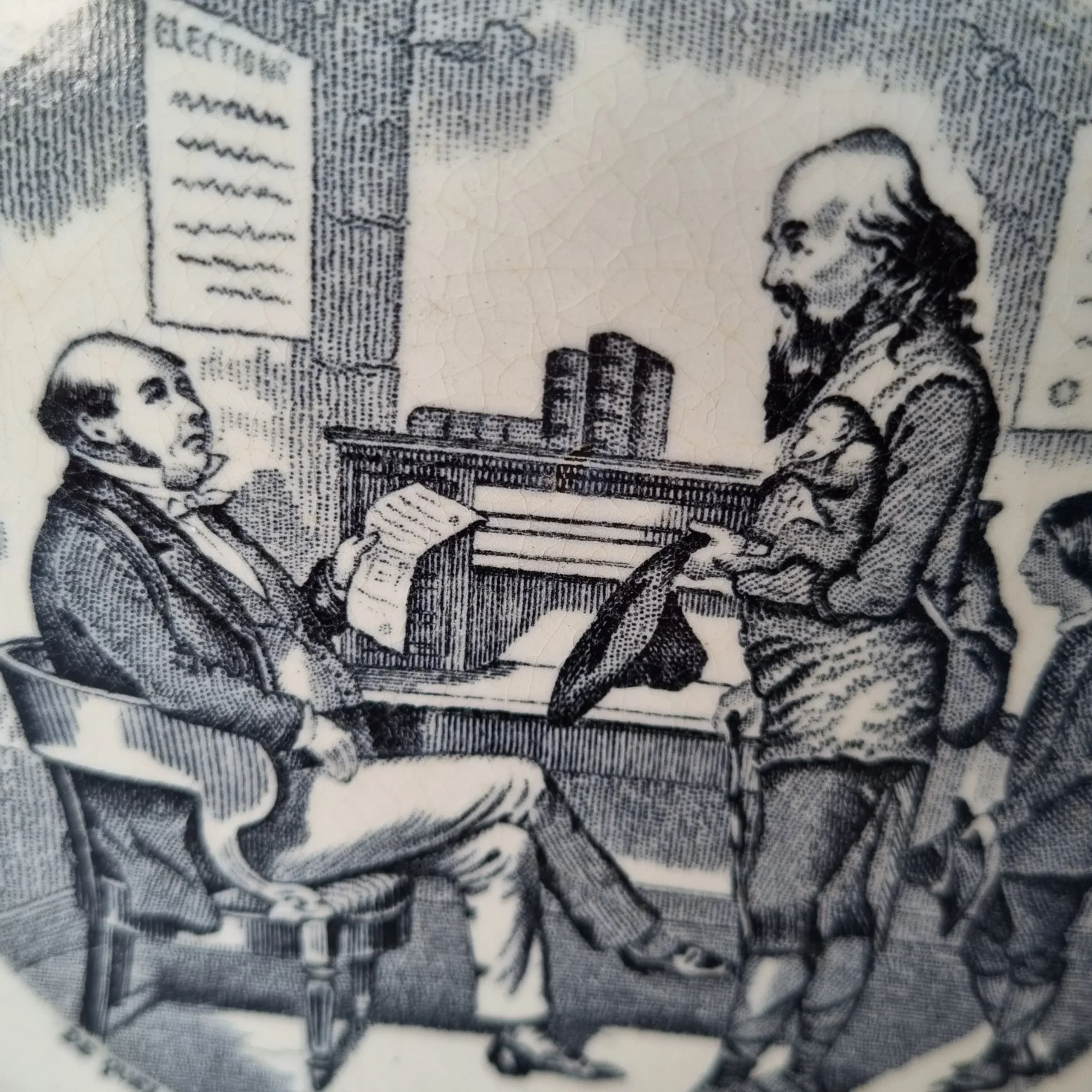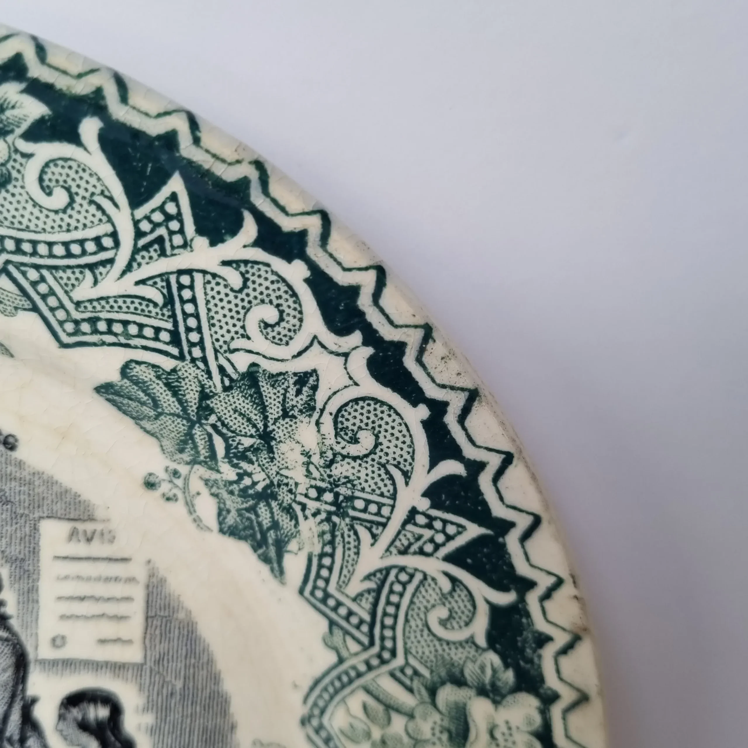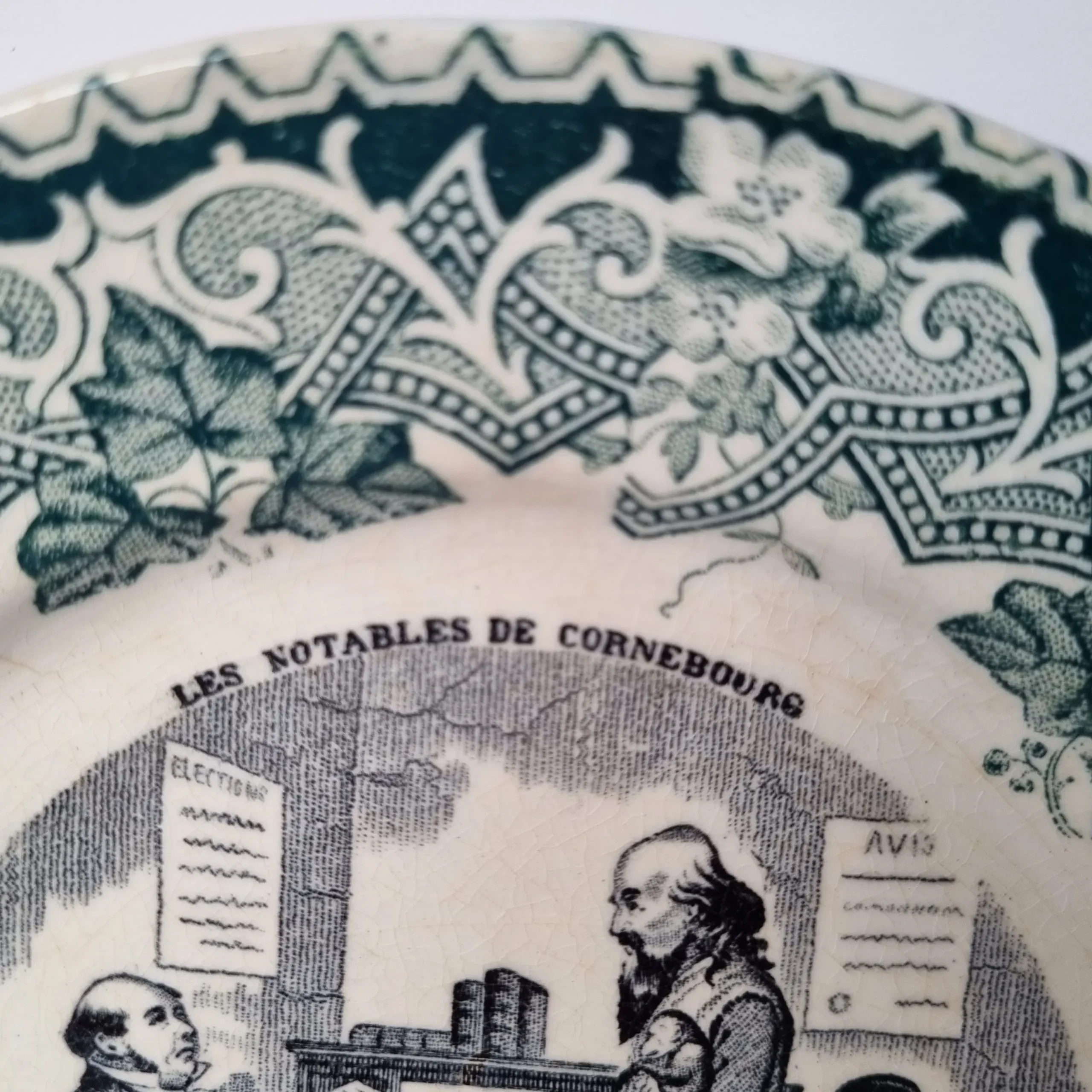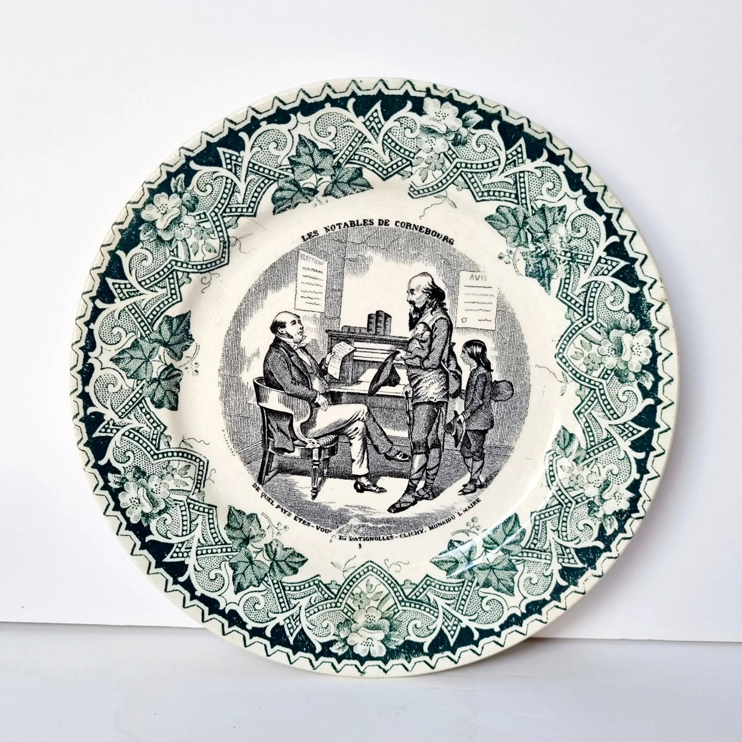 Colección de ocho platos de postre en semiporcelana procedentes de Luneville. Es un serie de platos «parlantes» franceses que ilustraban las historias cotidianas de la época. Aquí dedicada a los señores «notables» de Cornebourg. Ala decorada en verde e imágenes centrales impresas en negro sobre el esmalte blanco. Buen estado general de uso, con signos propios de su antigüedad. Observe las fotografías, forman parte de la descripción. Combinan bien con vajillas clásicas, en cerámica y porcelana. Francia, finales del siglo XIX.