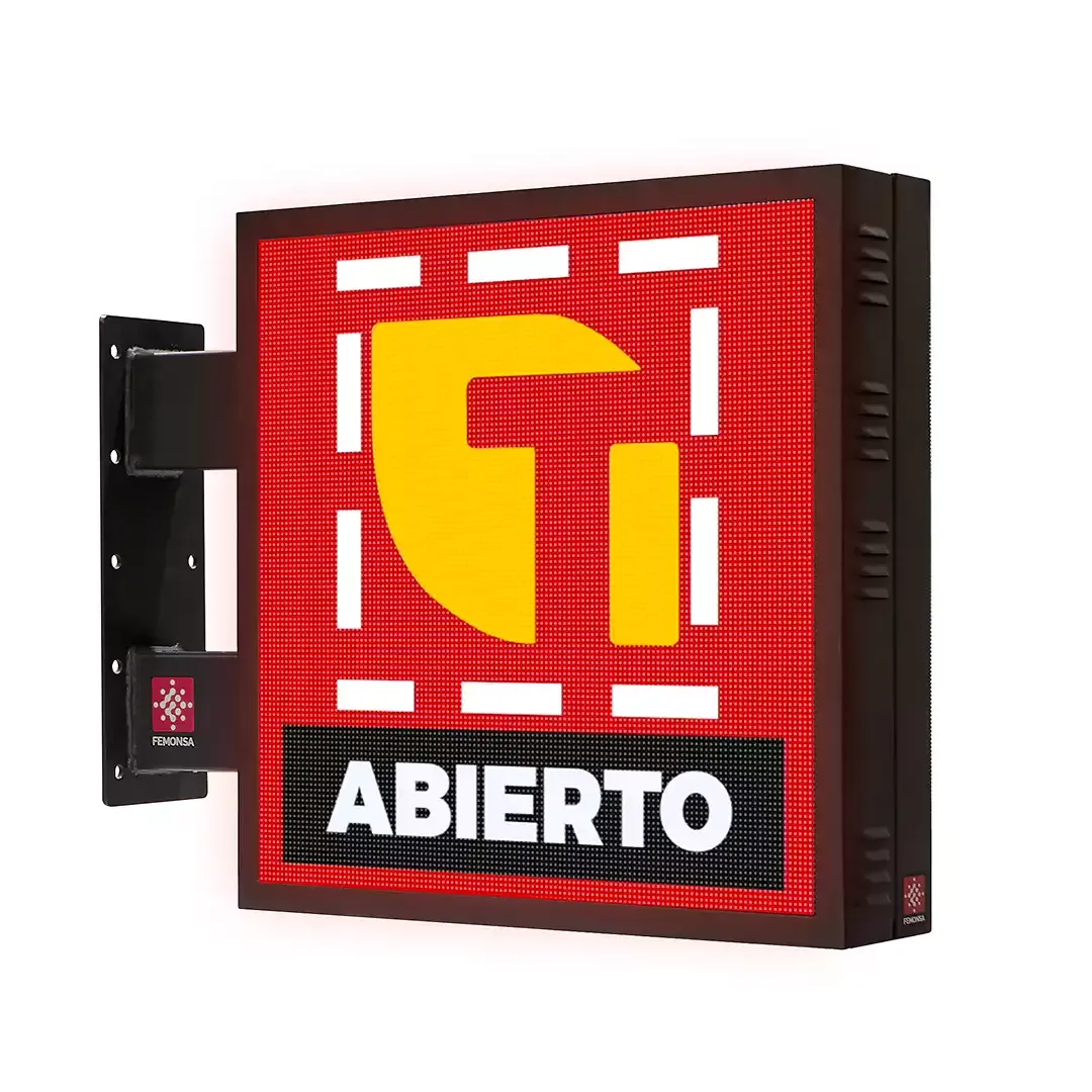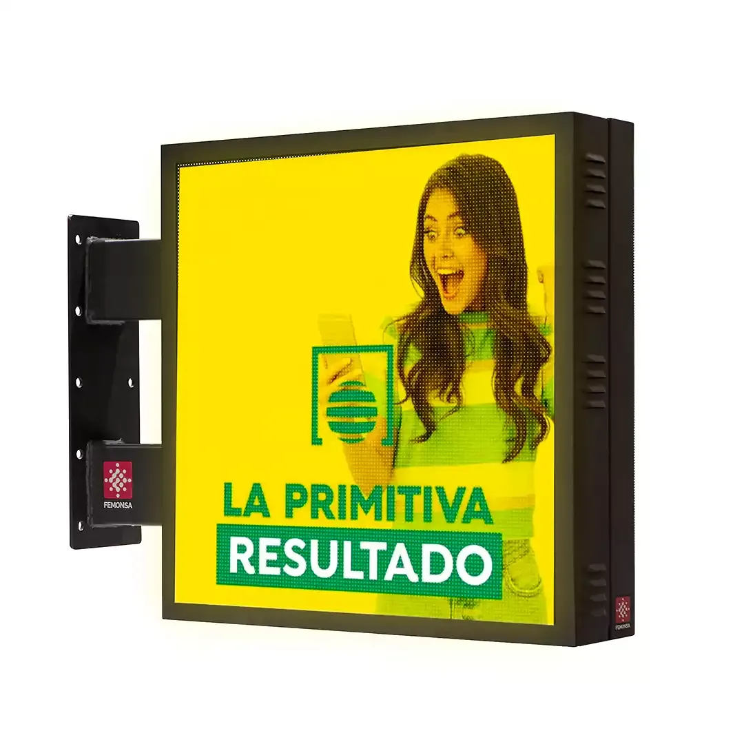 Para negocios que buscan impactar a medias y largas distancias. Con brazo metálico de instalación sencilla y 2 pantallas led integradas en un solo chásis con cierre de seguridad y totalmente estanco.