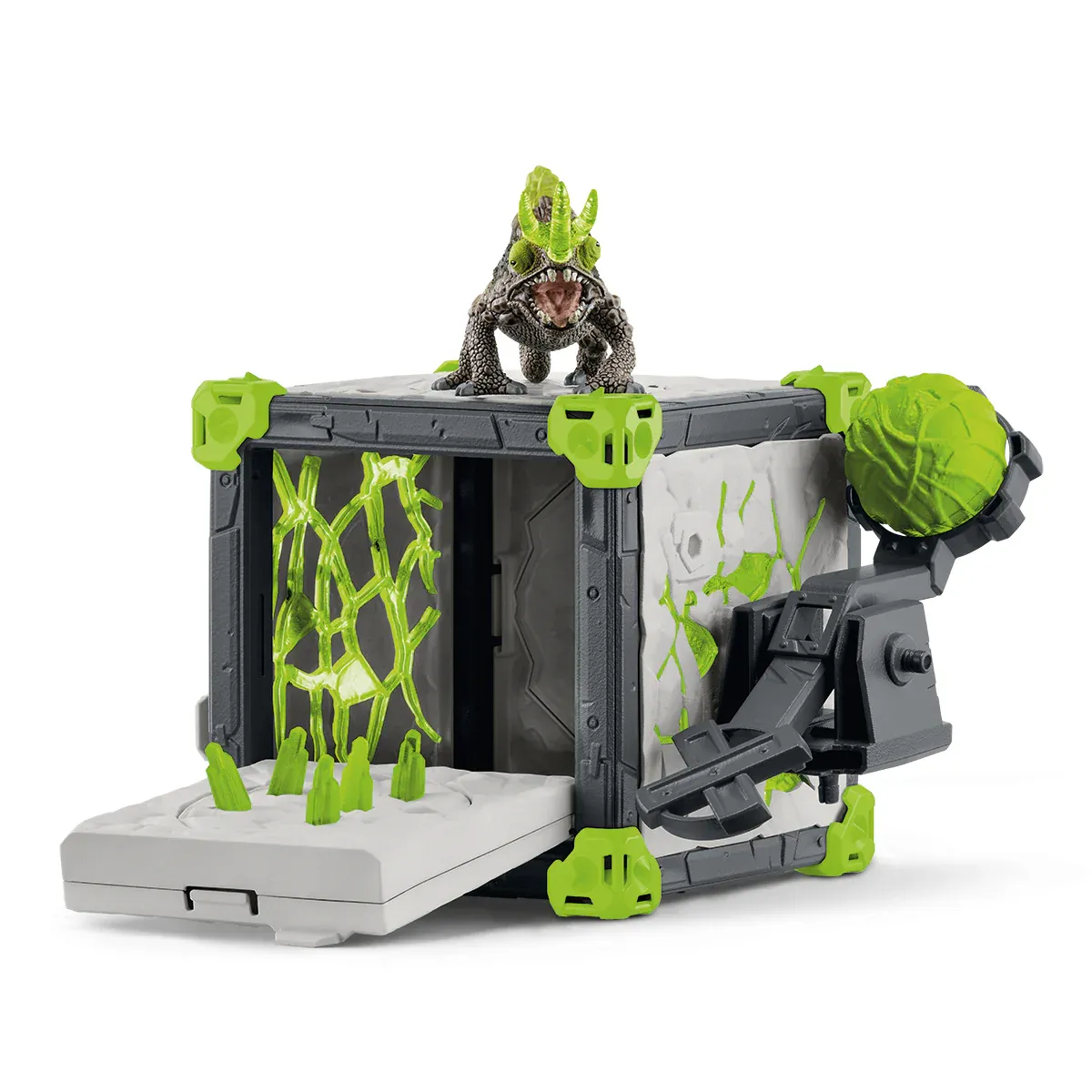 El camaleón de piedra ha convertido su BattleCave en una auténtica fortaleza para impedir que los ladrones roben el cristal que alberga en su interior. Puede ver desde lejos con sus grandes ojos si se acercan enemigos. Entonces coloca la catapulta en posición en el techo y carga la munición. ¡Será mejor que te pongas a cubierto para que no te alcance el gran proyectil! El camaleón es muy buen tirador y, si hace falta, puede colocar la catapulta en el lateral de la BattleCave. ¡Las BattleCaves de ELDRADOR® CREATURES convierten la habitación de cualquier niño en una zona de acción! ¿Quién se apunta a esta impresionante batalla? Todas las BattleCaves pueden combinarse. Así que siniestros túneles y desagradables trampas acechan a los atacantes, que se reúnen en el gran campo de batalla para batirse en duelo. ¡Menudo combate!