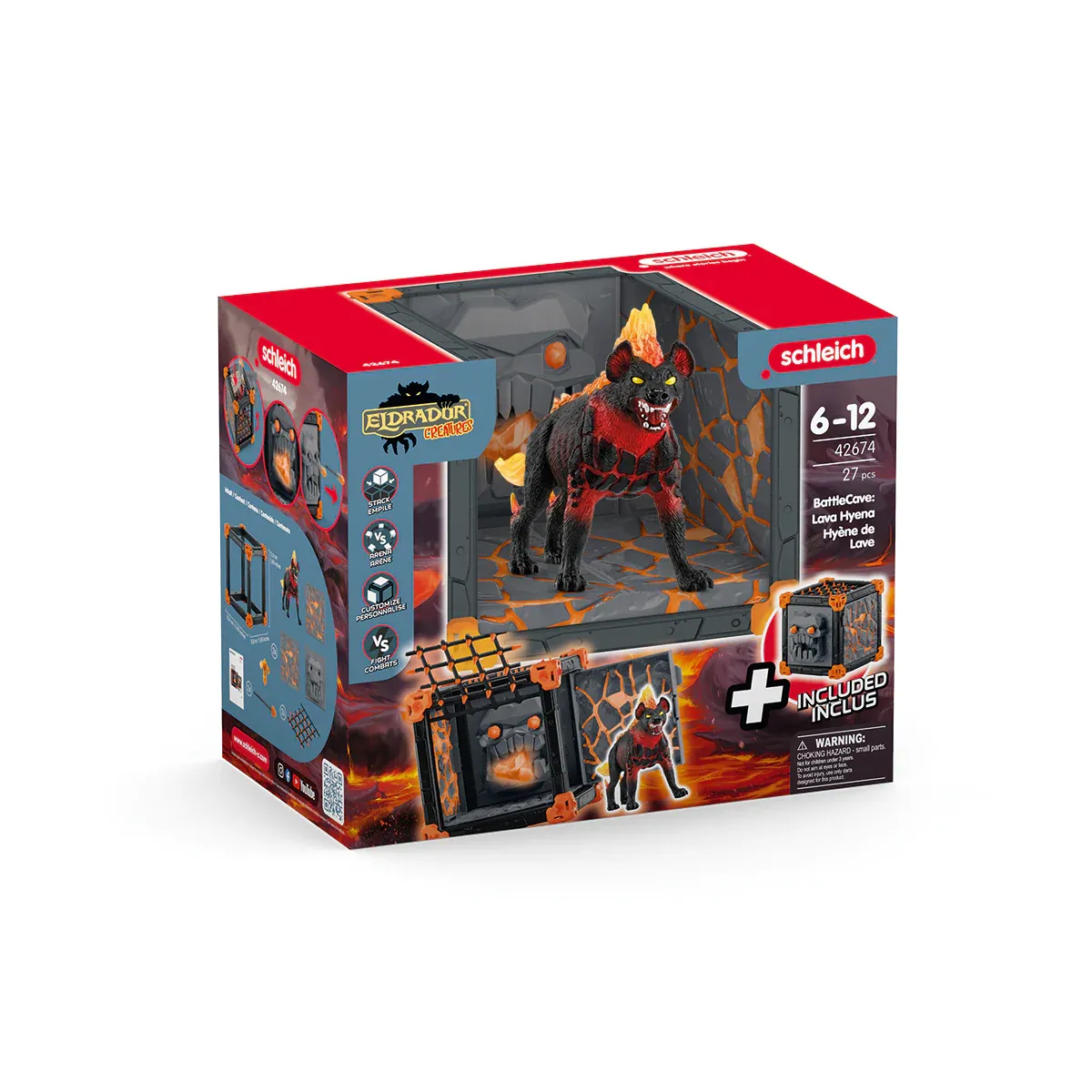 La hiena de lava se coloca amenazadora con ojos ardientes frente a su BattleCave. ¿Quién se atreverá a enfrentarse a ella? El cristal de su mundo está guardado en la BattleCave y ella lo defiende manteniéndolo entre los dientes. Es espeluznante, ¡los ojos son flechas! Si te atreves a subir a la BattleCave, ten mucho cuidado, porque los barrotes se abren fácilmente y se convierten en una insidiosa trampa. Si te quedas atrapado en la BattleCave, seguro que la hiena de lava no te deja huir así como así… ¡Las BattleCaves de ELDRADOR® CREATURES convierten la habitación de cualquier niño en una zona de acción! ¿Quién se apunta a esta impresionante batalla? Todas las BattleCaves pueden combinarse. Así que siniestros túneles y desagradables trampas acechan a los atacantes, que se reúnen en el gran campo de batalla para batirse en duelo. ¡Menudo combate!