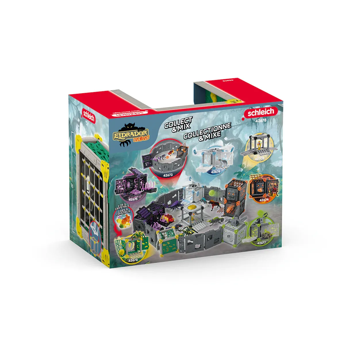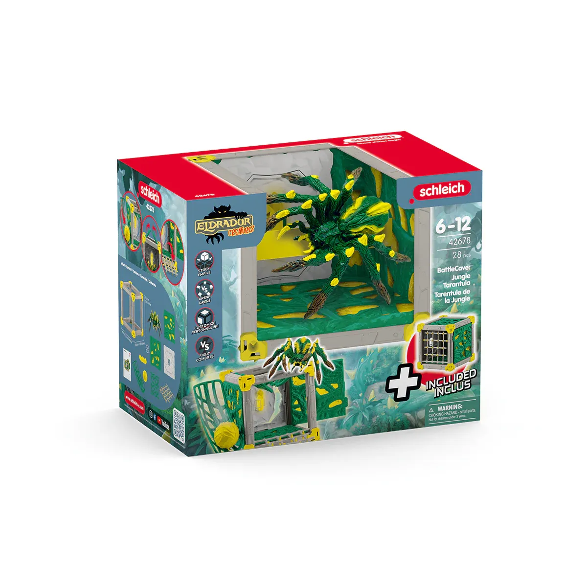 La tarántula de selva es un enemigo peligroso. Su mordedura venenosa es temible. ¡Es lógico que fuera la elegida para proteger el cristal que está en la BattleCave! Ahora acecha a los atacantes y los repele con un gran proyectil que lanza por la pista de rodaje que está en el lateral. ¡No intentes engañar a la tarántula de selva para entrar por el techo! Allí ha escondido una trampilla debajo de unas lianas. El que la pise caerá directamente en sus venenosos brazos. ¡Qué asco! ¡Las BattleCaves de ELDRADOR® CREATURES convierten la habitación de cualquier niño en una zona de acción! ¿Quién se apunta a esta impresionante batalla? Todas las BattleCaves pueden combinarse. Así que siniestros túneles y desagradables trampas acechan a los atacantes, que se reúnen en el gran campo de batalla para batirse en duelo. ¡Menudo combate!