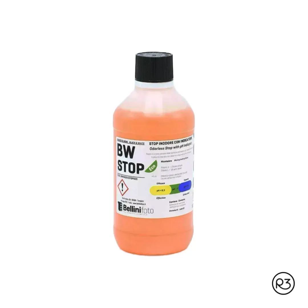 Bellini ECOSTOP es un baño de paro universal, ecológico e inodoro para todo tipo de películas y papeles en blanco y negro. Se recomienda encarecidamente el uso de un baño ácido para detener la acción del revelador de forma inmediata. El baño de paro ayuda a reducir la contaminación del fijador, prolongando la vida útil de éste.
