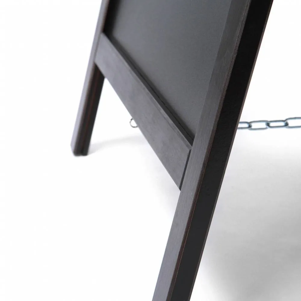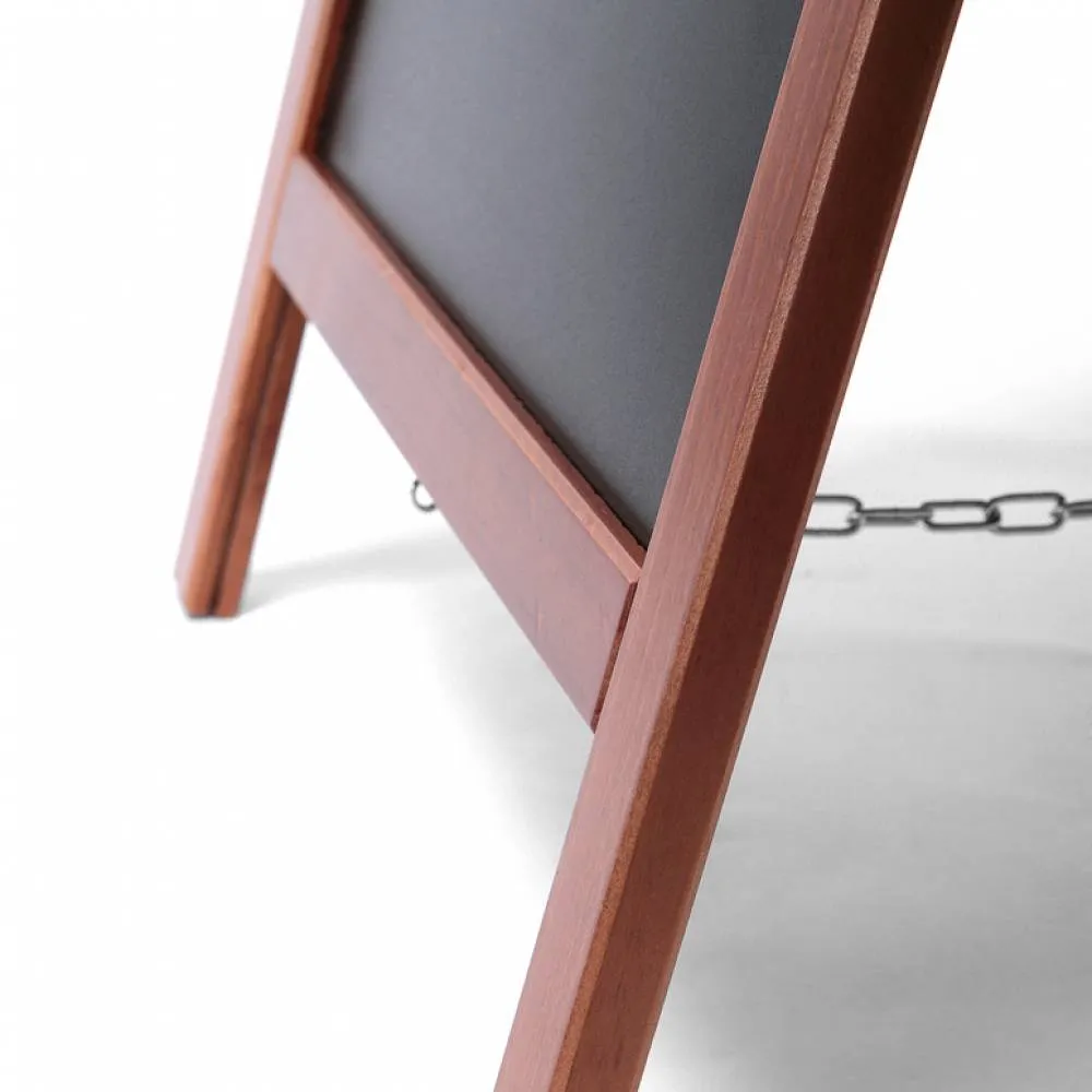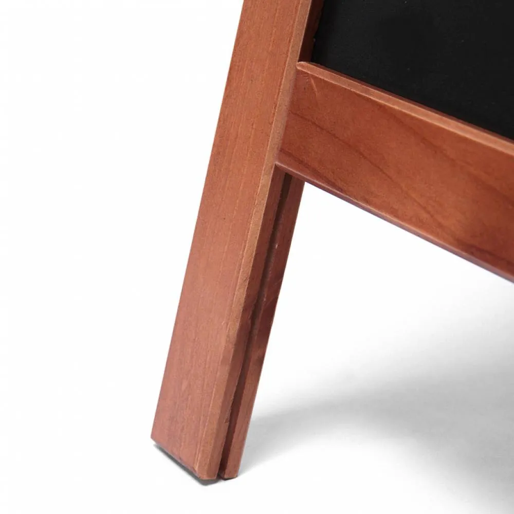 Pizarra doble de caballete en madera. La versión más ligera y económica de la gama. Ideal para hostelería y pequeño comercio. Marco de madera noble redondeado barnizado con barniz UV mate. Apta para uso tanto interior como en exterior cubierto. Pizarra en ambas caras para que escribas tus mensajes con los marcadores de tiza como rotuladores de tinta líquida. Limpieza fácil con una esponja húmeda. ¡Una pizarra caballete muy asequible y perfecta para tu negocio!