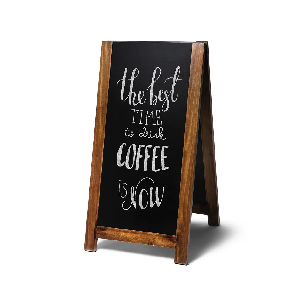Pizarra doble de caballete en madera de 59 x 107 cm. Diseño Vintage perfecto para bares, restaurantes, hoteles o pequeños comercios de inspiración retro. Marco plano de madera noble barnizado con barniz UV mate. Apta para uso tanto interior como en exterior cubierto. Pizarra en ambas caras para que escribas tus mensajes con los marcadores de tiza como rotuladores de tinta líquida. Limpieza fácil con una esponja húmeda. Bisagras de acero galvanizado.