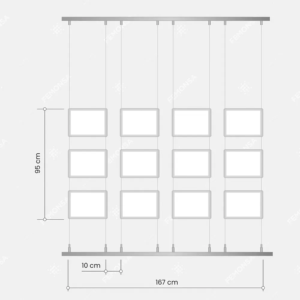 Pack de 9 carteleras luminosas LED multiposición con sistema de sirgas a suelo y techo.