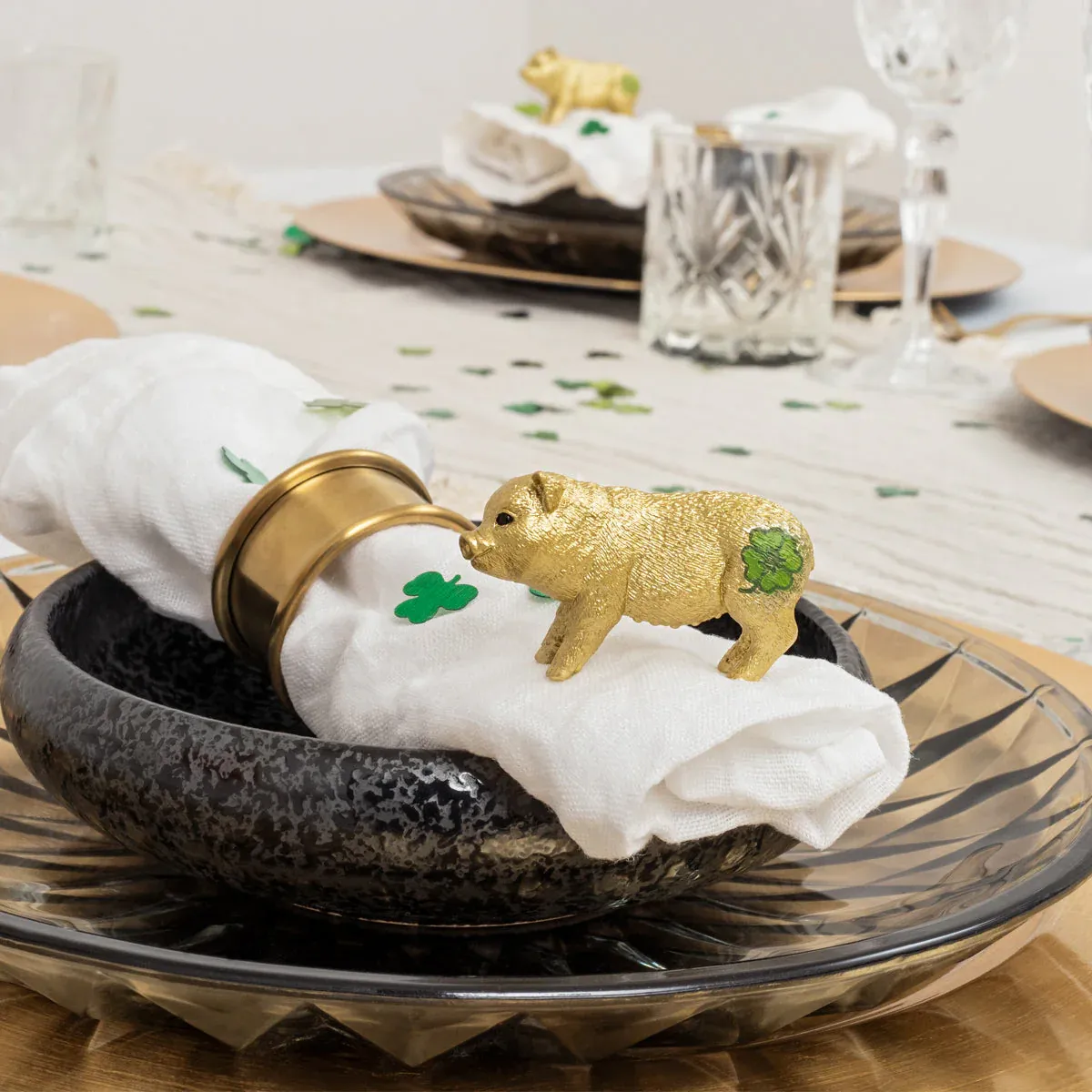 El año viejo llega a su fin y comienza un nuevo año. Al exclusivo Cerdo dorado de la suerte le encanta el cambio de año y lo que más le gusta es celebrarlo con amigos. Juntos recuerdan los momentos más bonitos del año que acaba y esperan con ilusión todo lo bueno que les espera. Se ha engalanado para celebrar esta fiesta como se merece y dar un poco más de suerte. Resplandece con su color dorado de los pies a la cabeza y tiene el flanco adornado con un tatuaje de la suerte: un trébol de cuatro hojas. Ya está todo listo para Nochevieja y Año Nuevo. ¿En qué fiesta de Nochevieja podrá bailar? ¡No puede faltar en tu colección!