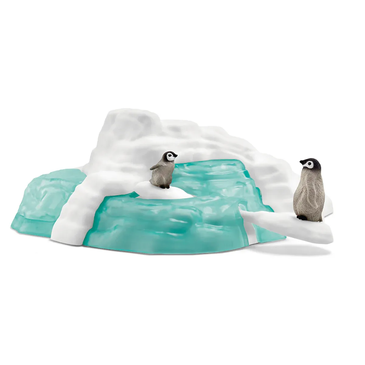 ¡Las crías de pingüino son muy salvajes! El más grande se tira sin parar por el tobogán de hielo y se desliza una y otra vez por la resbaladiza pista de hielo. Y plaf, aterriza en el agua. Vuelve nadando rápidamente al témpano con el tobogán. ¿Qué ruido es ese? ¡Oh, el pingüino bebé está saliendo del huevo! Y quiere unirse enseguida a la diversión en familia de pingüinos. Todavía le cuesta un poco andar y se sube al balancín de hielo.