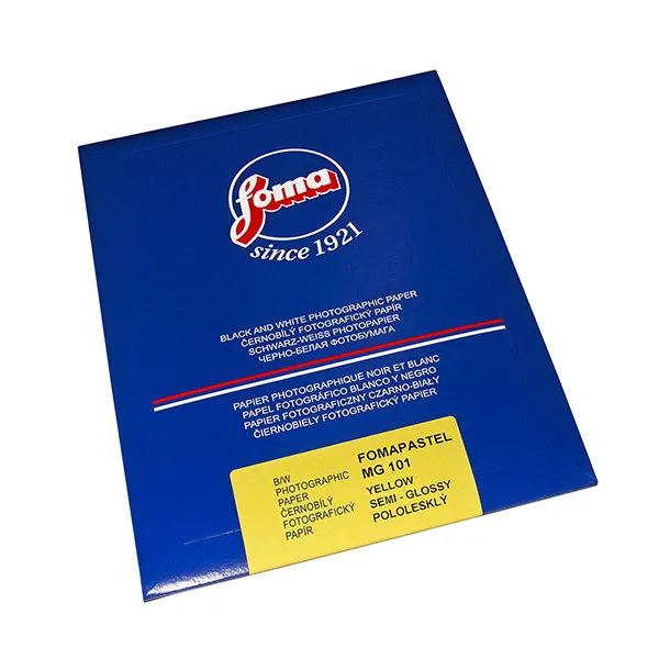 FOMAPASTEL MG se fabrica utilizando una emulsión de clorbromuro de plata, que proporciona un tono neutro a la imagen y se caracteriza por un negro profundo. FOMAPASTEL MG es papel baritado (FB) de doble peso (DW) con un acabado semibrillo y se ofrece en seis colores: cian, magenta, amarillo (CMY) y rojo, verde, azul (RGB).
