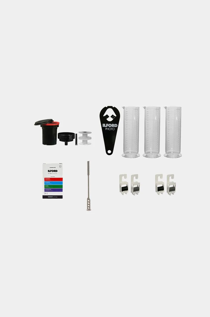 El kit contiene: 1 abridor de chasis de película ILFORD de 35mm, 1 pack de químicos ILFORD Simplicity (contiene revelador, baño de paro, fijador y agente humectante), 1 tanque de revelado Paterson, 2 espirales Paterson Super System, 3 cilindros graduados Paterson de 600 ml, 1 termómetro Paterson, 1 agitador Paterson. 2 juegos de pinzas para colgar película a secar.
