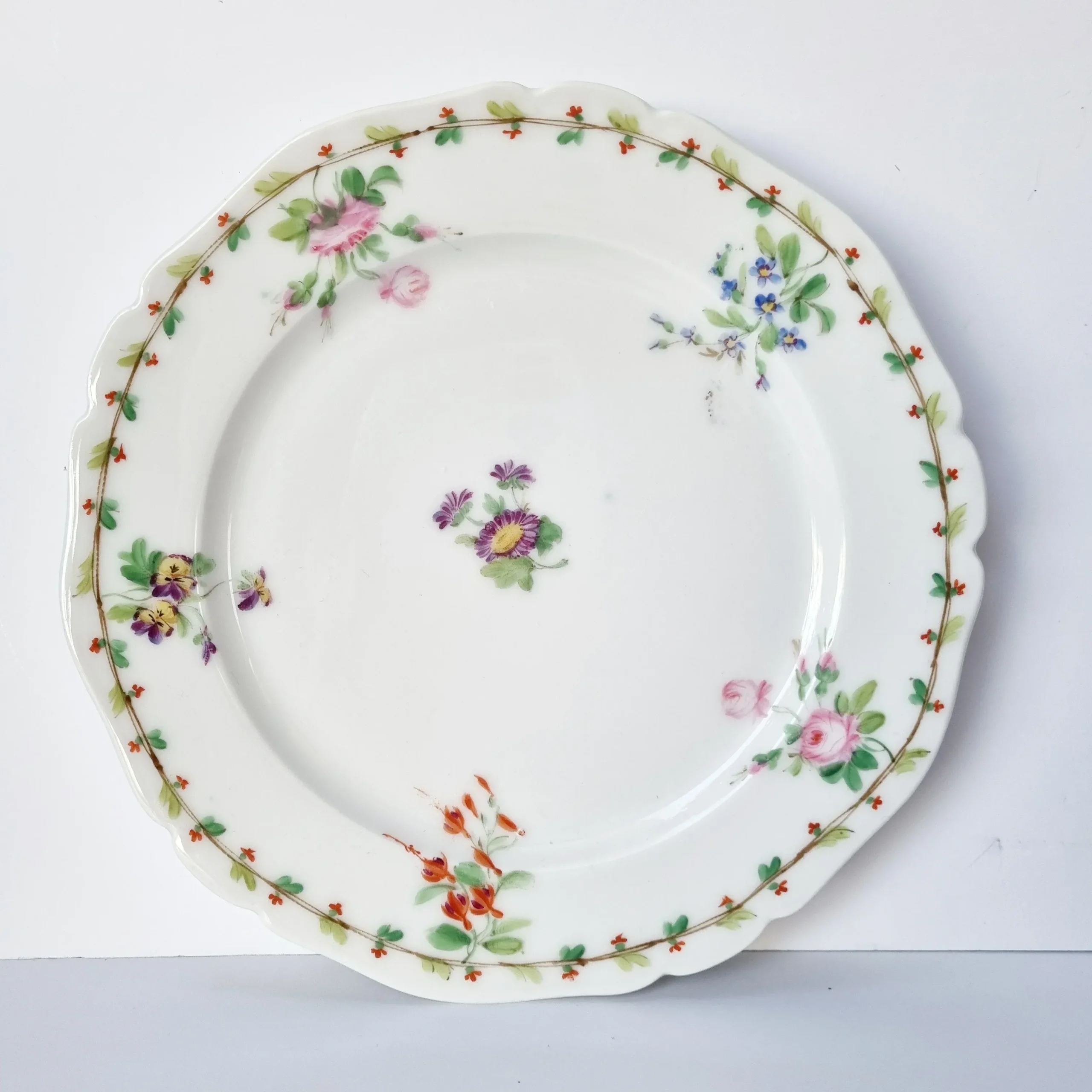 Set de seis platos de postre en porcelana de París. Francia, principios del siglo XX. Porcelana blanca, bordes ondulados, decorado con bouquets de flores policromados y guirnaldas en el borde de los platos. Sin firma. Buen estado vintage. Sin accidentes ni reparaciones. Puede presentar ligeras marcas coherentes con su antigüedad y uso anterior. Colores y brillo inalterados. Observe las fotografías, forman parte de la descripción. Dimensiones: 21 cm de diámetro.