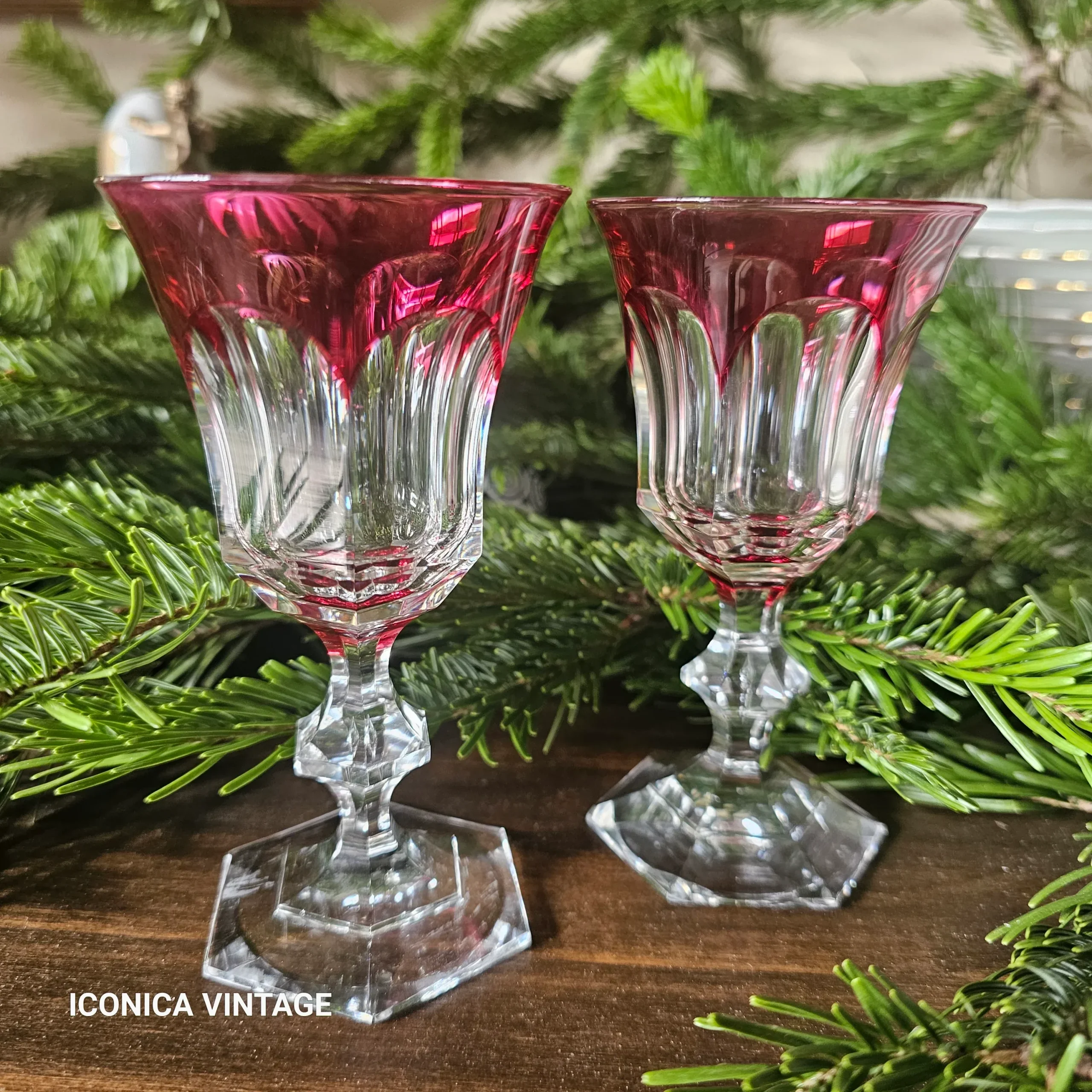 Juego de ocho copas de vino de cristal transparente tallado, estilo Baccarat, decorado en color fucsia. Un deleite para los sentidos. En perfecto estado vintage. Francia, mediados del siglo XX. Altura de las copas, 13 cm. Diámetro en boca, 7 cm.