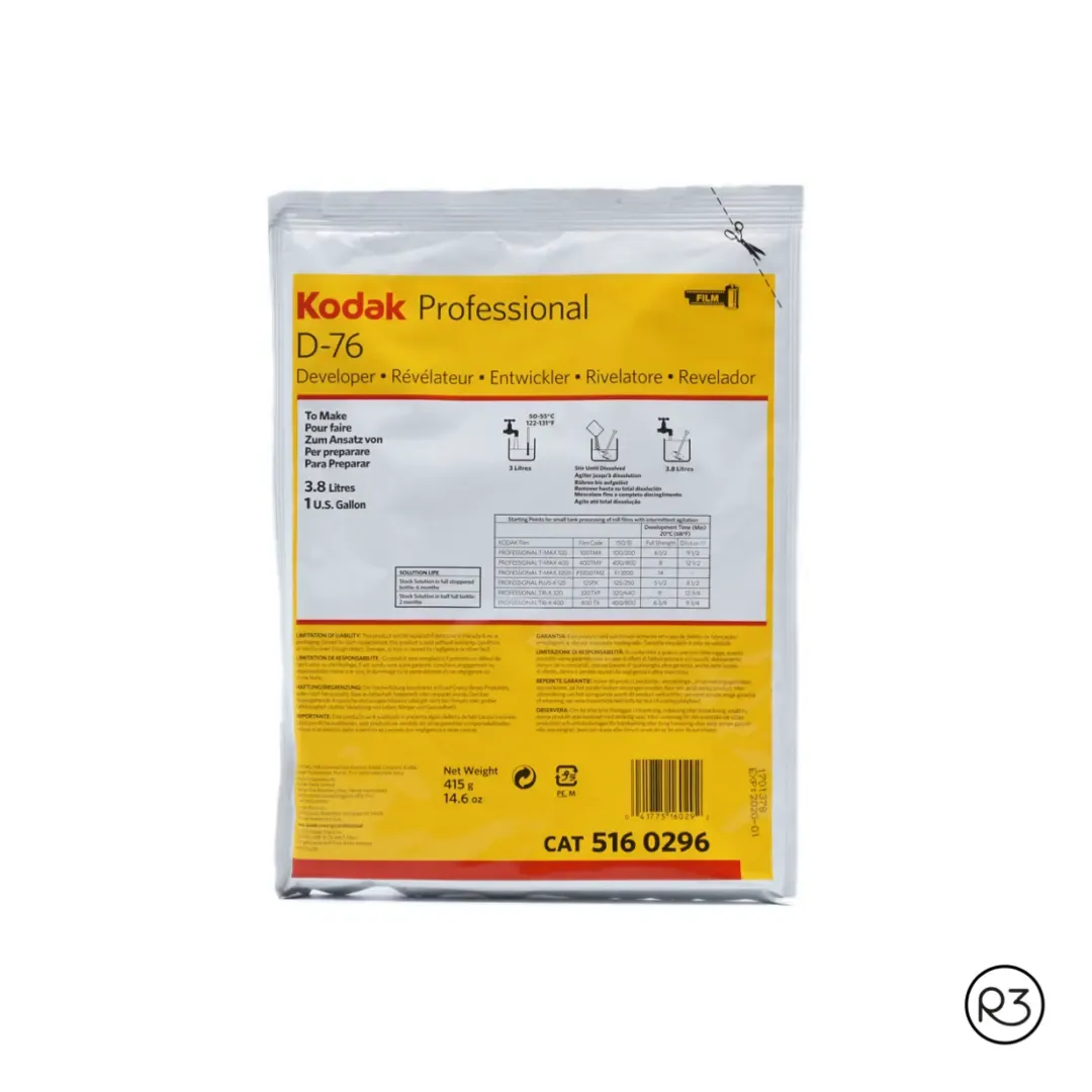 Este revelador ofrece resultados consistentes y nítidos. Su formulación equilibrada permite una reproducción de tonos precisa y un grano fino, destacando los detalles en cada fotografía. El Kodak D-76 proporciona una gama completa de grises para películas en blanco y negro con excelente detalle en sombras, convirtiéndose así probablemente en el revelador más popular del mundo.