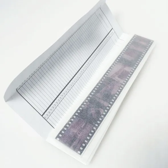 Cartera para negativos, tipo acordeón, para guardar película 35mm (7 tiras de 6 fotogramas cada una). Cierre mediante solapa. Con espacio para registrar los datos de los fotogramas (interior y exterior). Ideal para enviar negativos por correo. También interesante como sistema de archivo.