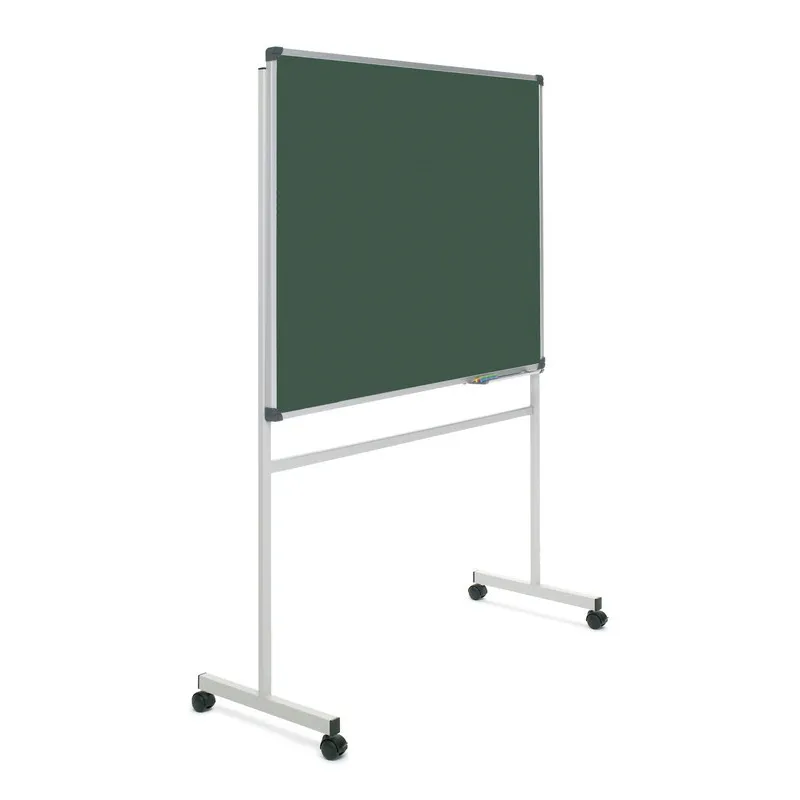 Pizarra laminada verde con soporte en T. Superficie laminada en alta presión. Enmarcada con perfil de aluminio anodizado en color plata mate y cantoneras redondeadas de plástico gris.