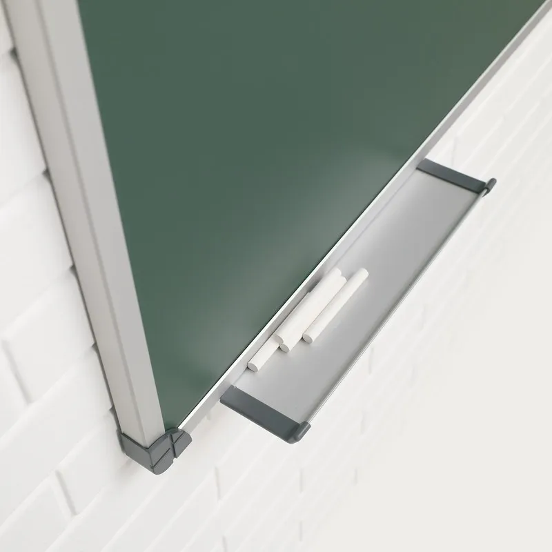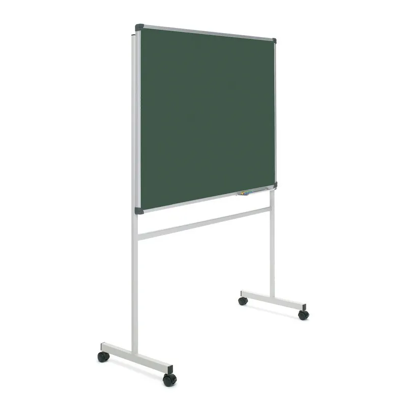 Pizarra de pie en acero vitrificado verde con soporte en «T». Enmarcada con perfil de aluminio anodizado en color plata mate. Superficie de acero vitrificado a 800ºC con garantía de por vida.