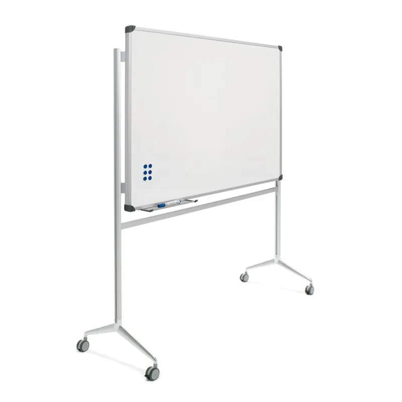 Pizarra de Pie con soporte en Y de acero vitrificado blanco con garantía de por vida. Enmarcada con perfil de aluminio anodizado de color plata mate.