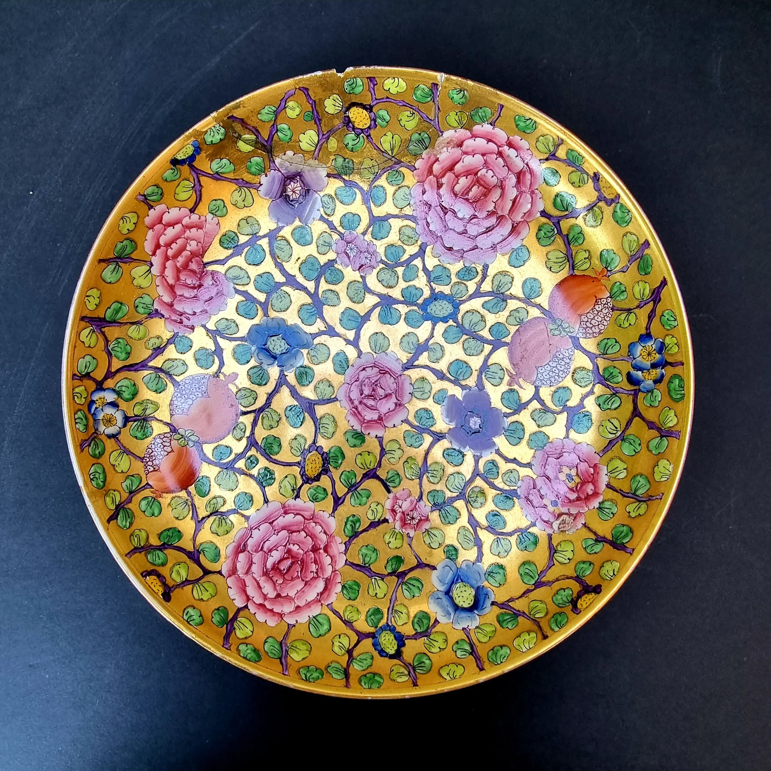 Gran plato ornamental decorado en oro y pintado a mano con flores orientales. Restaurado. Tiene algunos pequeños accidentes. Firmado. Observe las fotografías, forman parte de la descripción .