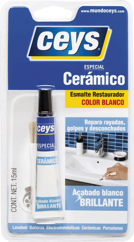 Esmalte de color blanco de fácil aplicación, indicado para reparar rayadas, golpes y desconchados en superficies esmaltadas y en todo tipo de cerámicas (porcelana, loza, cocinas, baños, lavabos, bañeras, electrodoméstico, vajillas, porcelanas…). Resiste al calor, al frío, a temperaturas de hasta +100ºC, al agua caliente y agentes limpiadores. Seca rápidamente con un acabado brillante y duradero. Incluye pincel aplicador