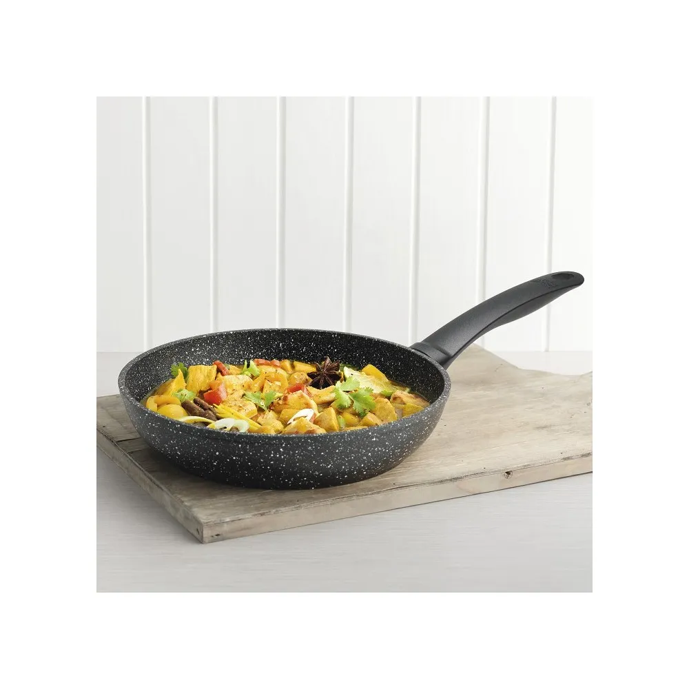Sartén fabricada en aluminio forjado con un revestimiento antiadherente con acabado de piedra. Apta para todo tipo de cocinas, incluida inducción.