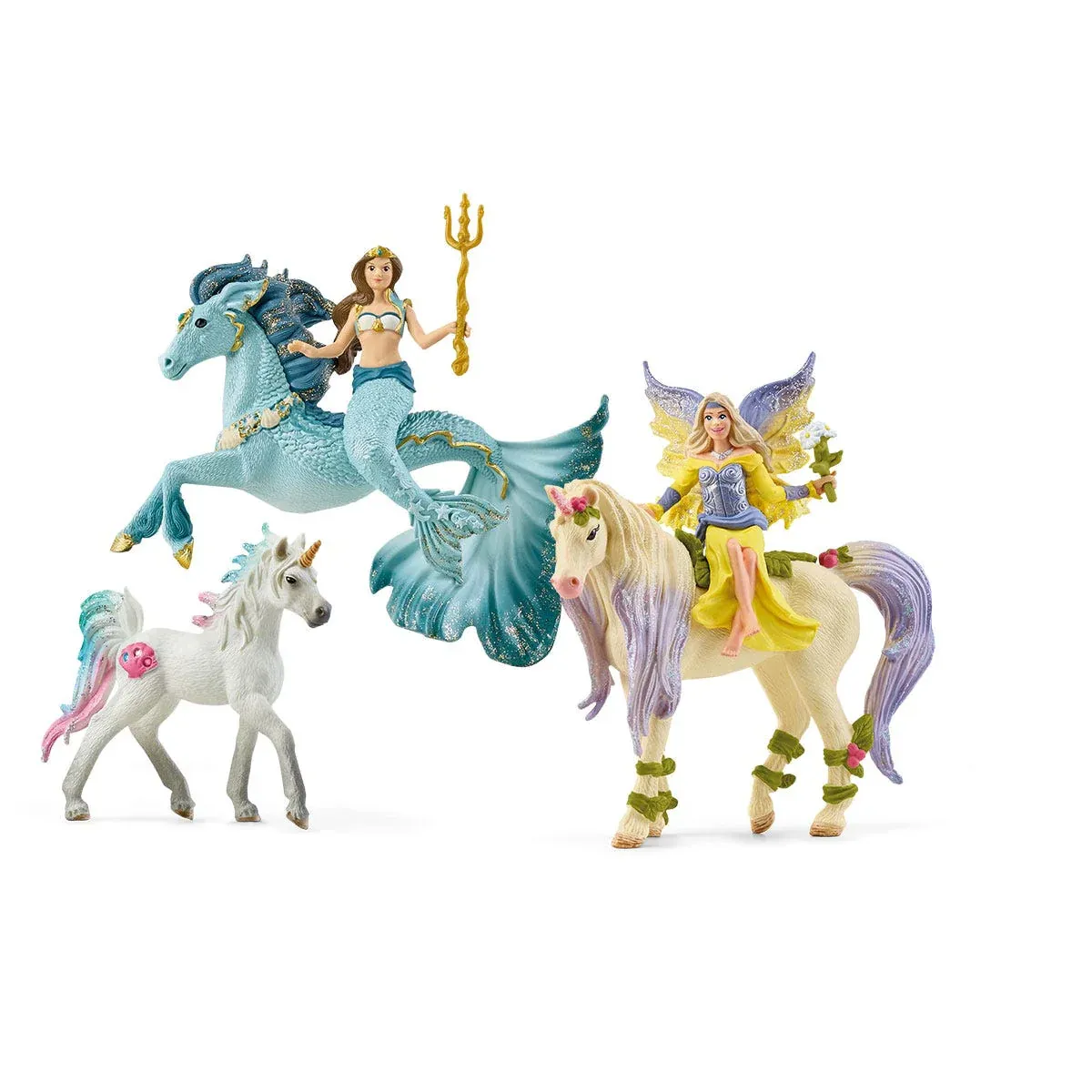 ¡Menudo brillo! Con el set de iniciación BAYALA® de schleich®, tu habitación se convertirá en un maravilloso mundo de fantasía en el que podrás vivir emocionantes aventuras. Las coloridas crines del potro de unicornio marino, la sirena Eyela sobre el unicornio submarino y el hada Sera con su unicornio pegaso llaman enseguida la atención. Todos los animales de juguete y los peluches de tu casa se quedarán completamente maravillados. Pero también porque hay purpurina por todas partes. Siempre se cae de la cola de los caballos. ¿Podrías ayudar a cepillar los caballos después de cenar?