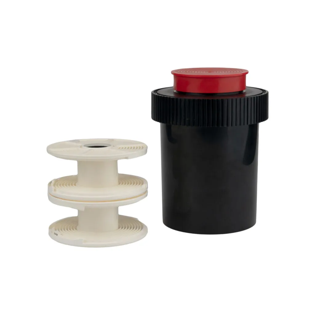 Tanque de revelado modelo Classic, para películas en blanco y negro y color equipado con dos espirales. Resistente al calor, estanco y opaco a la luz.