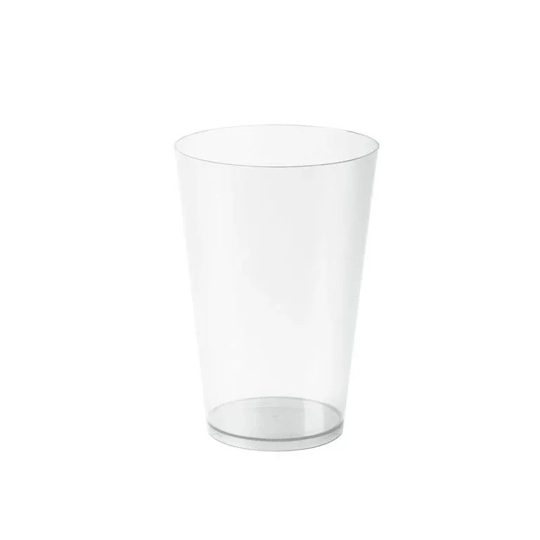 Con un diseño cónico y una capacidad de 400 CC, son ideales para servir agua, refrescos u otras bebidas. Fabricados con PP irrompible, estos vasos ofrecen resistencia y reutilización, siendo perfectos para su uso en exteriores, picnics o eventos.