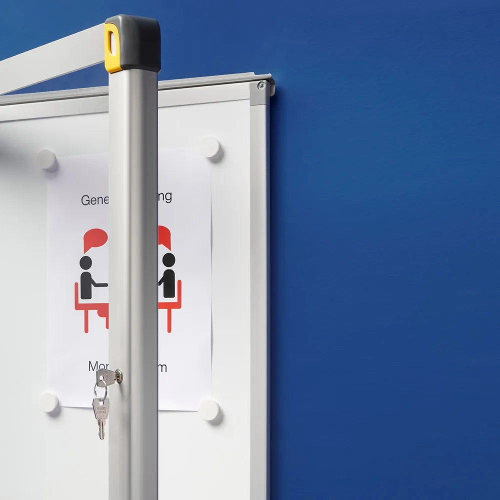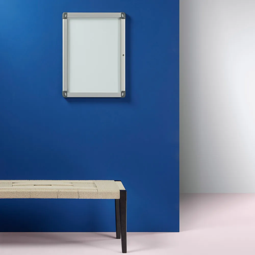 Vitrina de anuncios mural con marco de aluminio anodizado en color plata mate de puerta abatible de cristal templado y cerradura con llave.